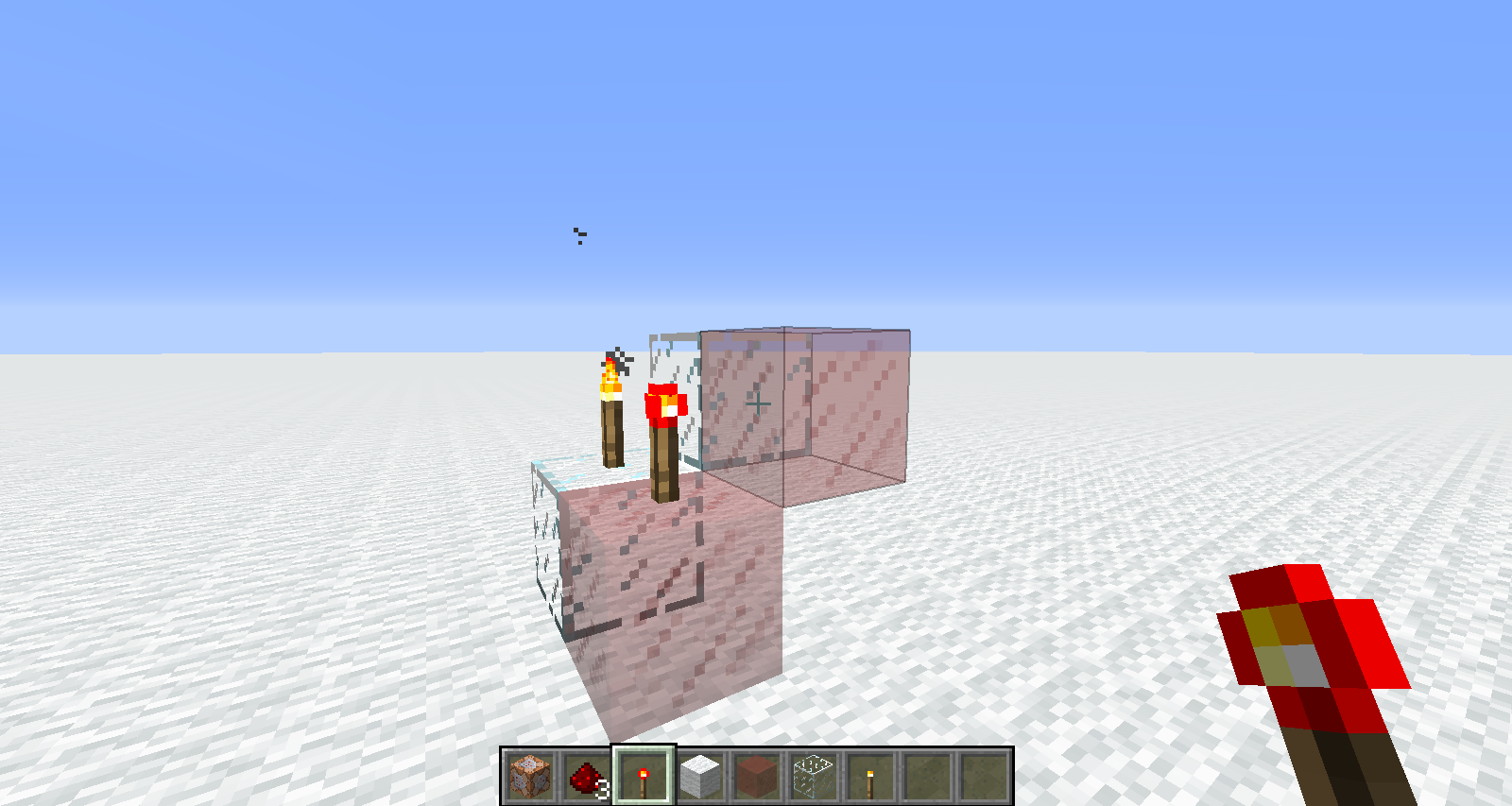 In the attachment, you see what happens after trying to place torches and redstone torches on the side of the top right glass blocks.