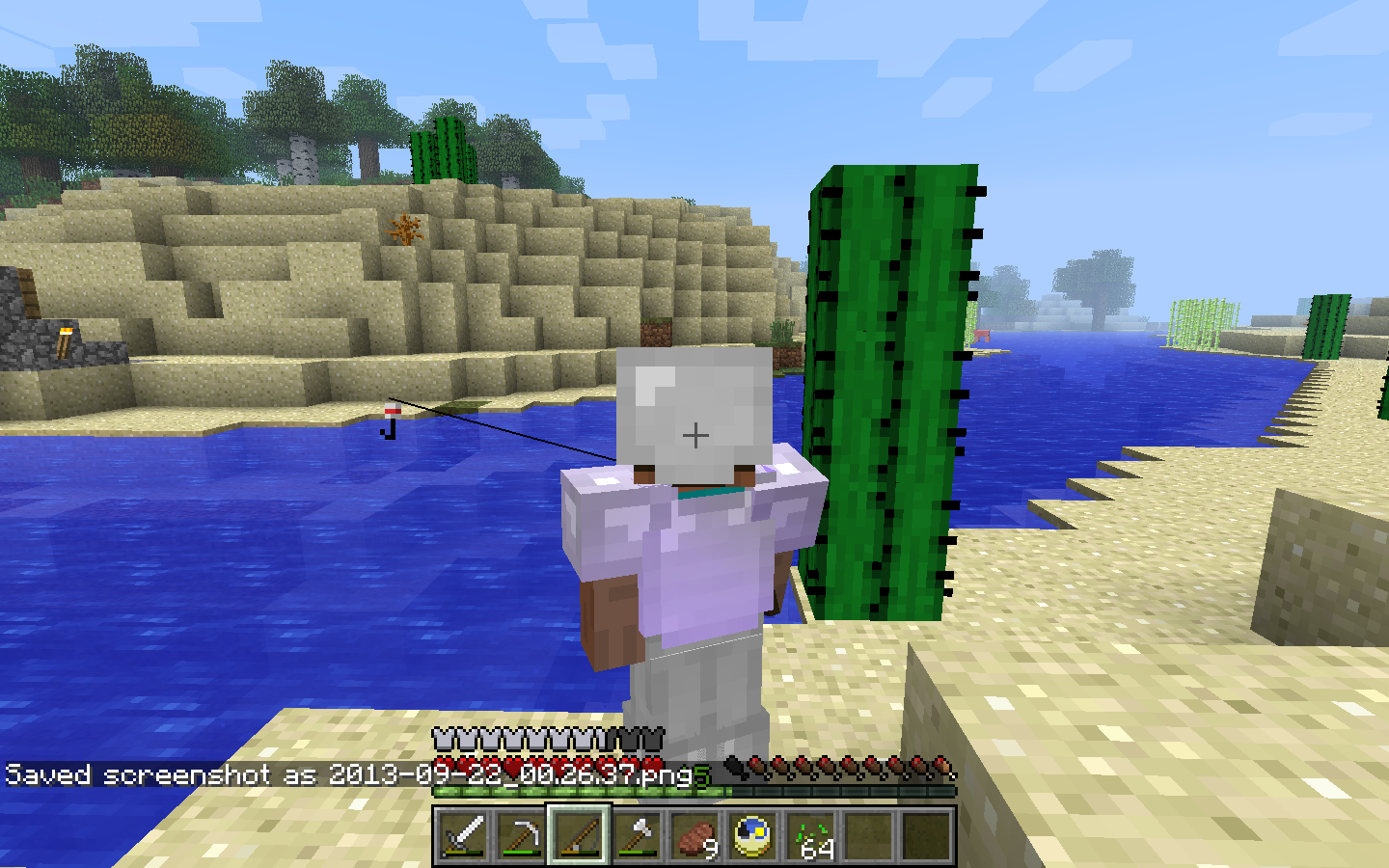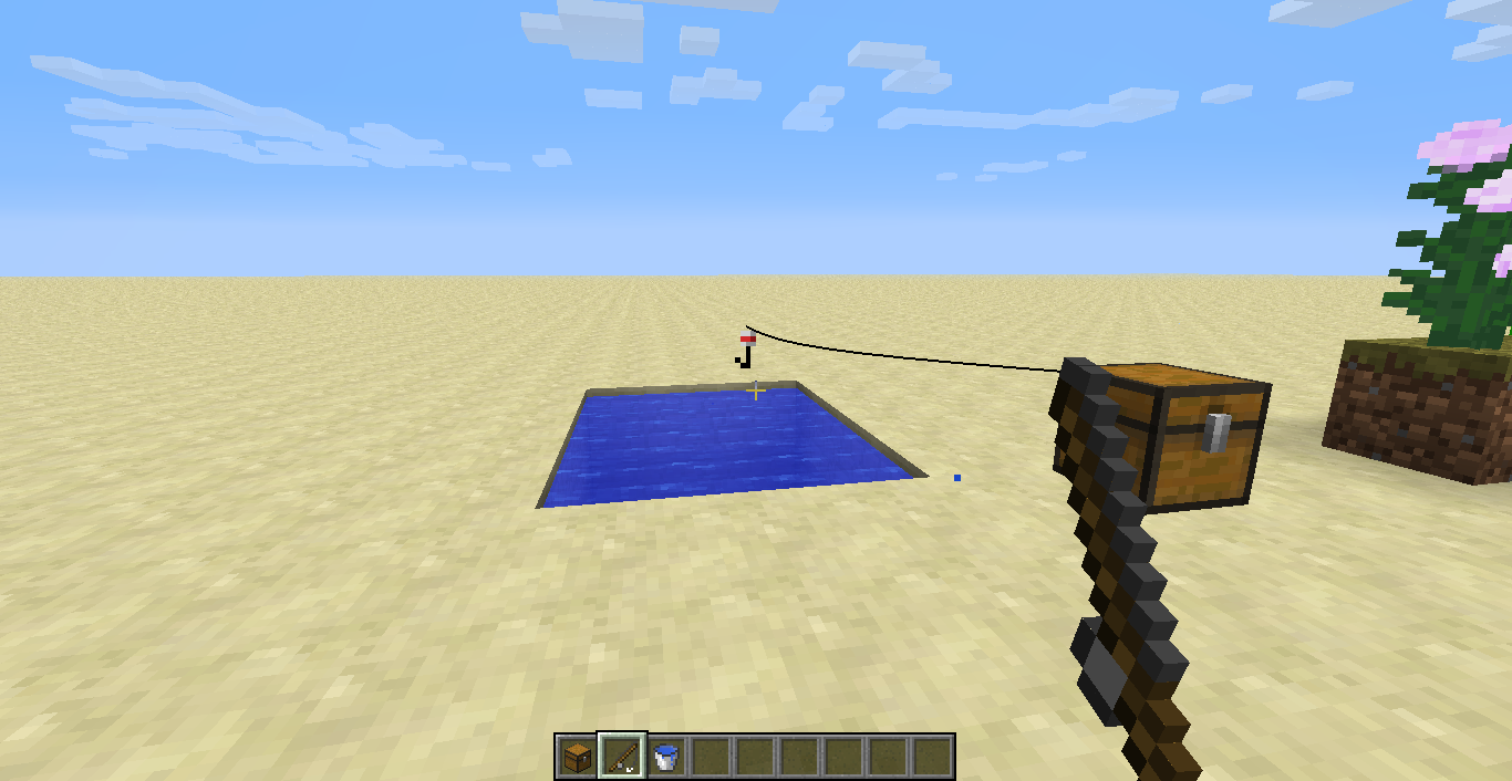 Cast into two-deep water and the bobber will often glitch to one block above the surface of the water. Other casts may cause the bobber to glitch between 1 meter under water and the surface. In this case it still produces bubbles as it moves.