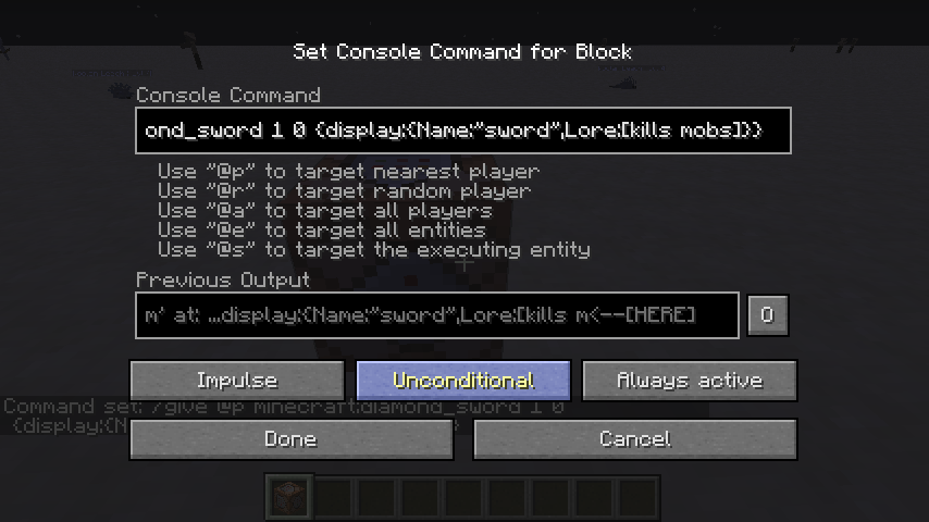 When I enter a command eg: /give @p minecraft:diamond_sword 1 0 {display:{Name:"sword",Lore:[kills mobs]}} the command doesn't work and it tells you "data tag parsing failed: Expected ']' but got 'm' at: ...display:{Name:"sword",Lore:[kills m<--- [HERE]