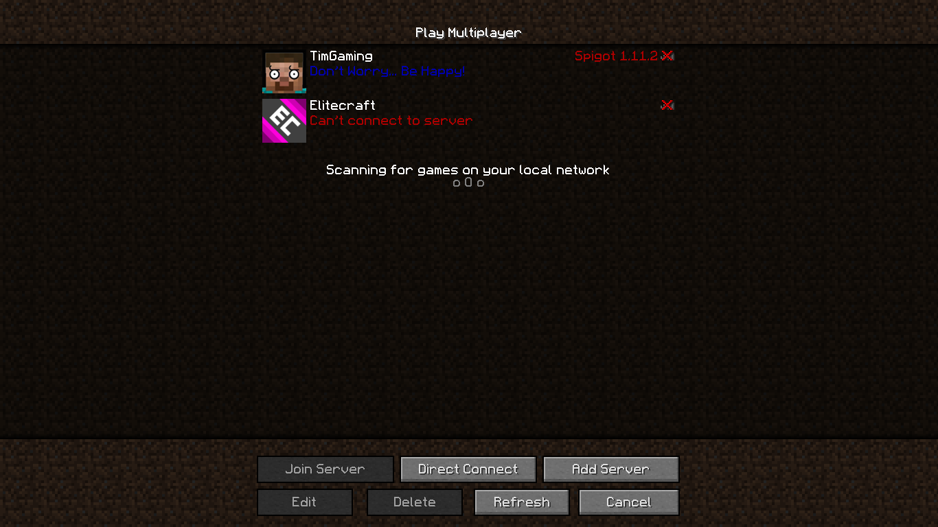 The first time the Multiplayer menu is loaded, one of the listed servers will almost always fail to ping, saying "Can't connect to server". However, upon pressing the Refresh button, it works just fine. This is an issue for servers because potential users will assume the server is down when it isn't.