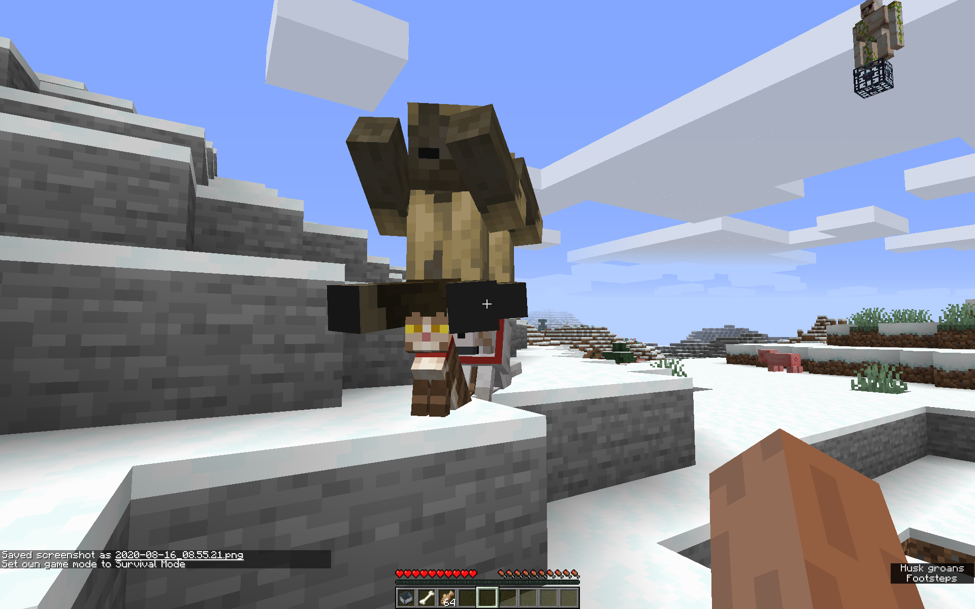 Switch into survival and wait for the husk riding the wolf to notice and begin pathfinding to you.