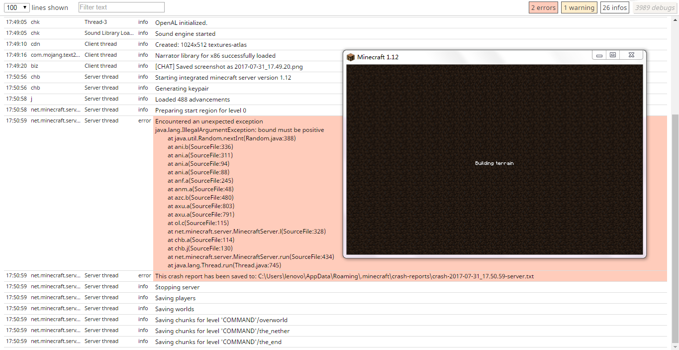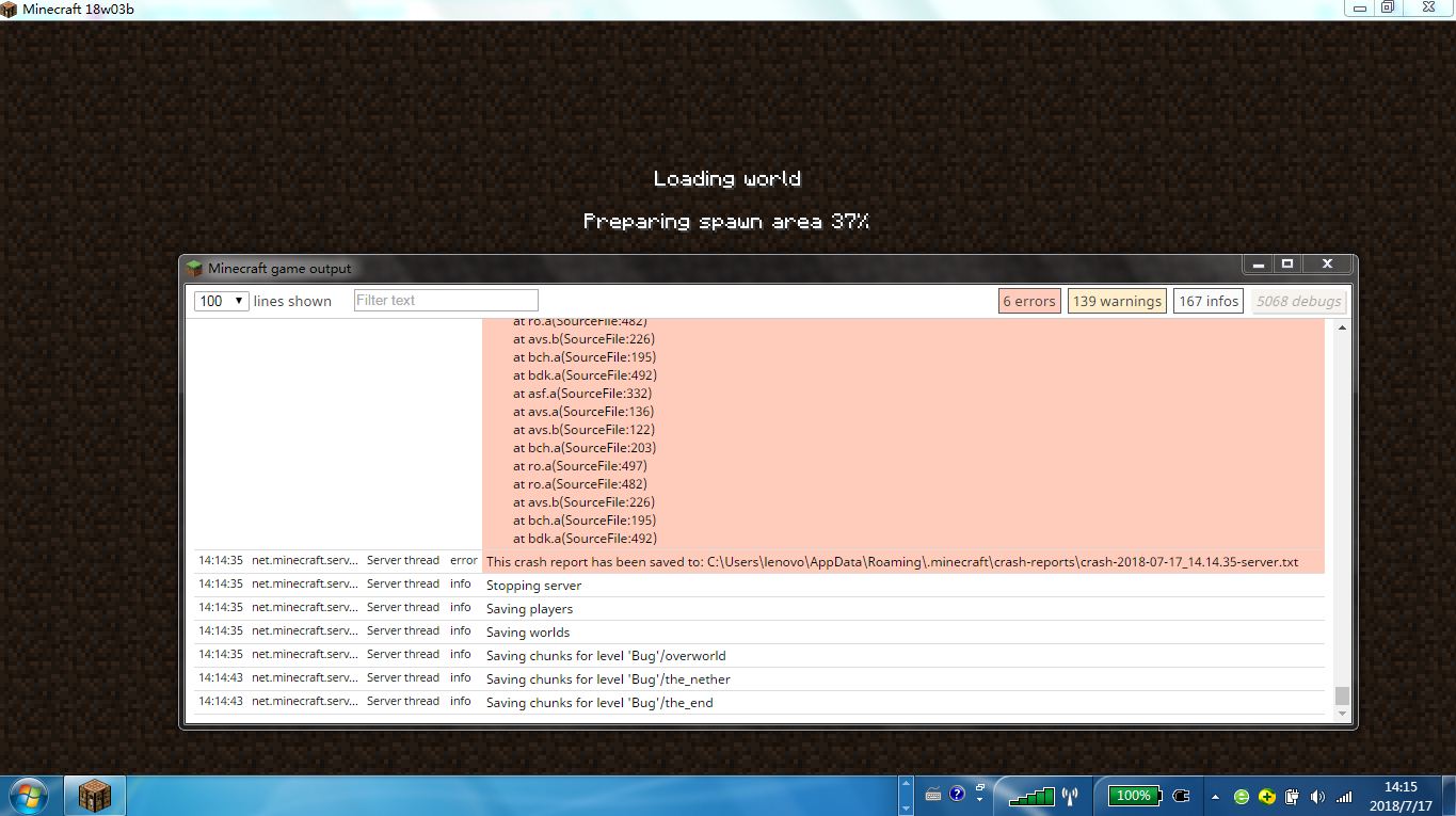 1.13 snapshotsย ย It throws a crash report but Minecraft still displays "Loading world Perparing spawn area"
