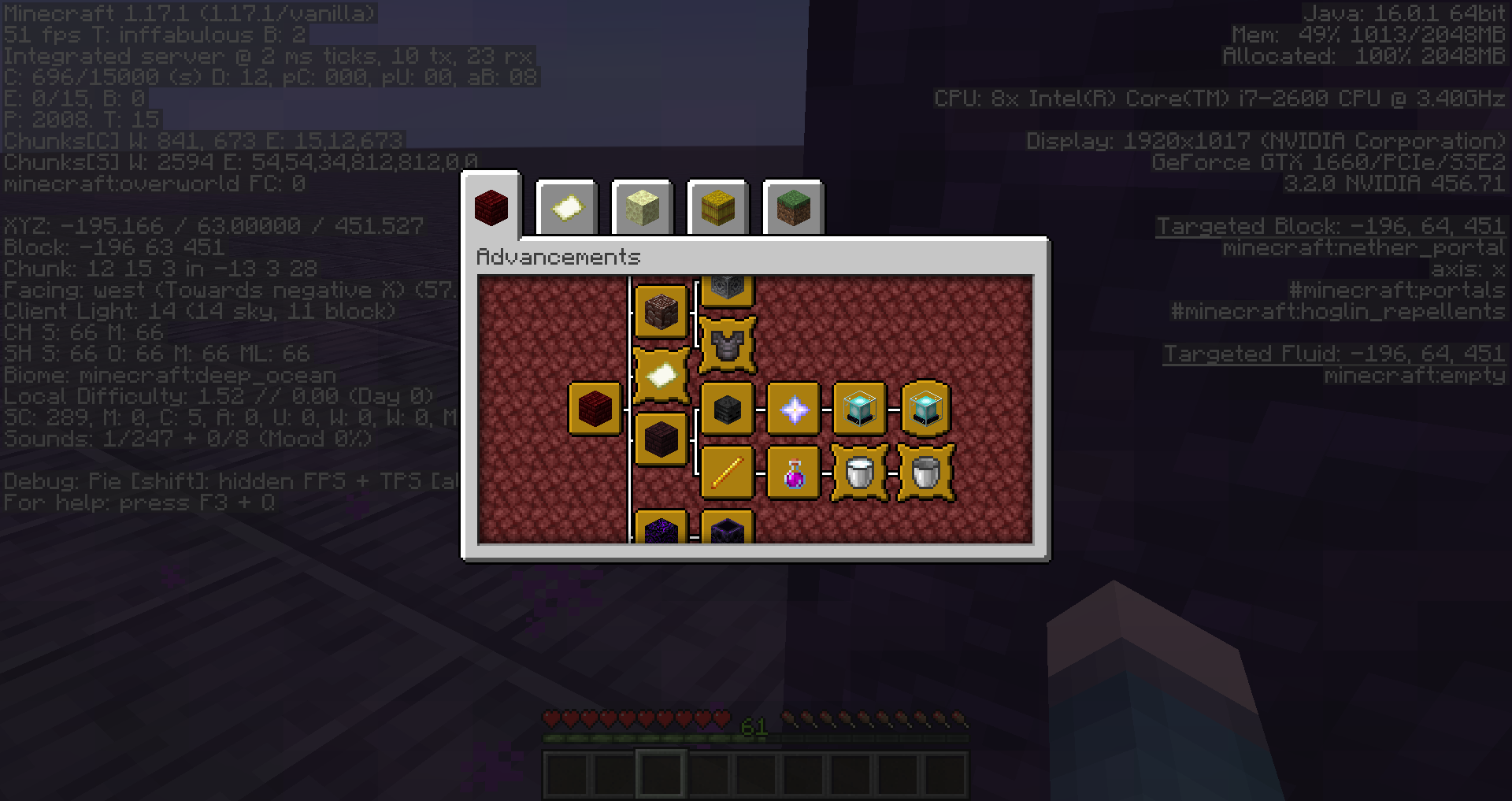 }the overview can not be invoked while the player is inside of a portal. However, this also causes the overview to disappear when you open it from the pause menu while standing inside of a portal; and also the game does not stop while being in the advancements overview, which probably is not intended.