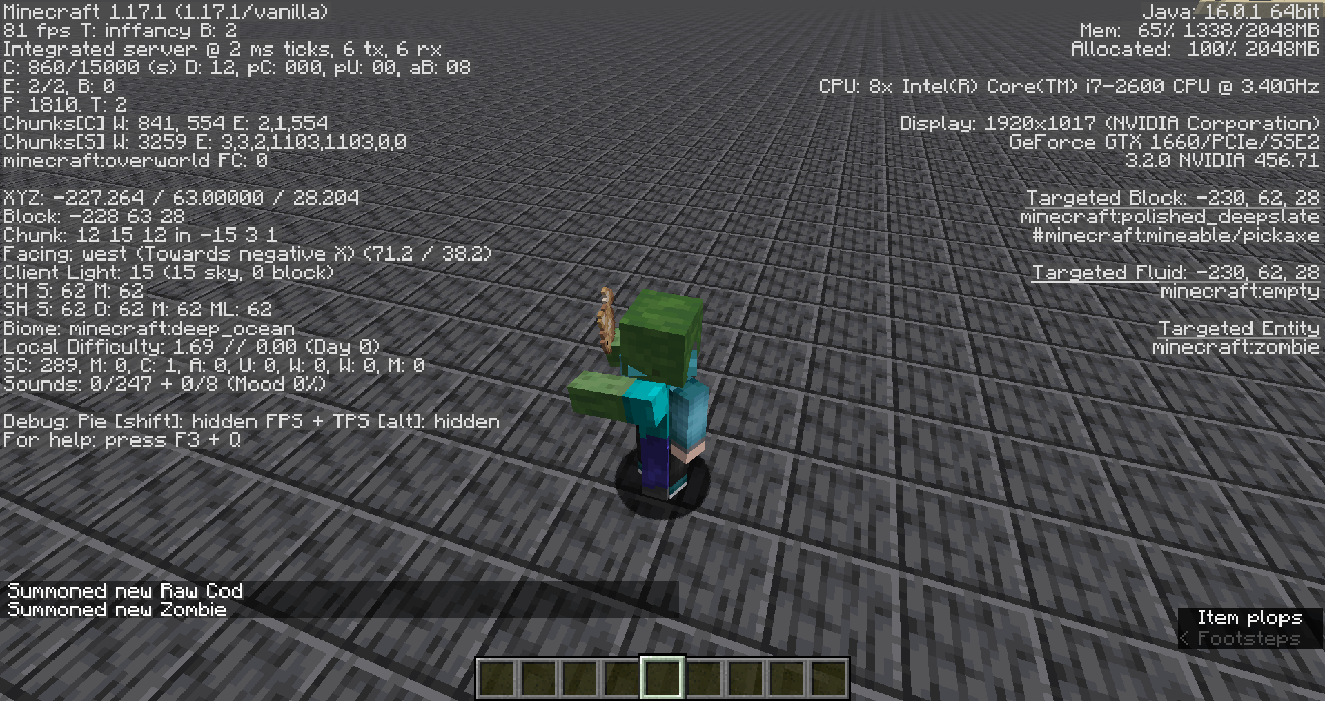 /summon zombie ~ ~ ~ {CanPickUpLoot:1b}You'll notice the zombie pick up the fish that was not meant to be accessible by it.