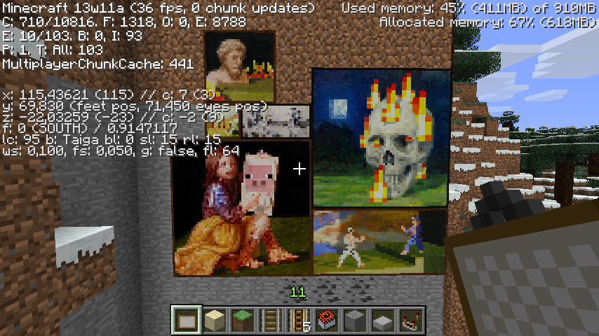 Aparently, in the lastest snapshot, it is implossible to place any 4x4, 4x2, or 4x3 paintings on minecraft. i tried to fill a wall of açç those dimensions with a single painting. and unlike other versions of minecraft, (in wich the large pic was usualy the first one to be choose)it never placed the ones in this size, even after many tries, and even triyng in bigger spaces. i'm pretty sure this must be a issue from this snapshot, as in all other versions the paintings worked perfectly fine. that's all