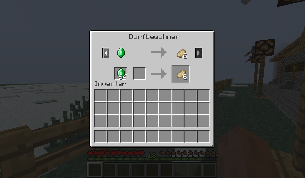 If one acts with a villager, and he for 1 Emerald offers 16x pork (for example), uses this offer, and add a 64-stack emeralds in the trade window Places and SHIFT-click the pork purchases, and then by ESC the trade window closes, you get almost all emeralds back, but has nonetheless bought pork.