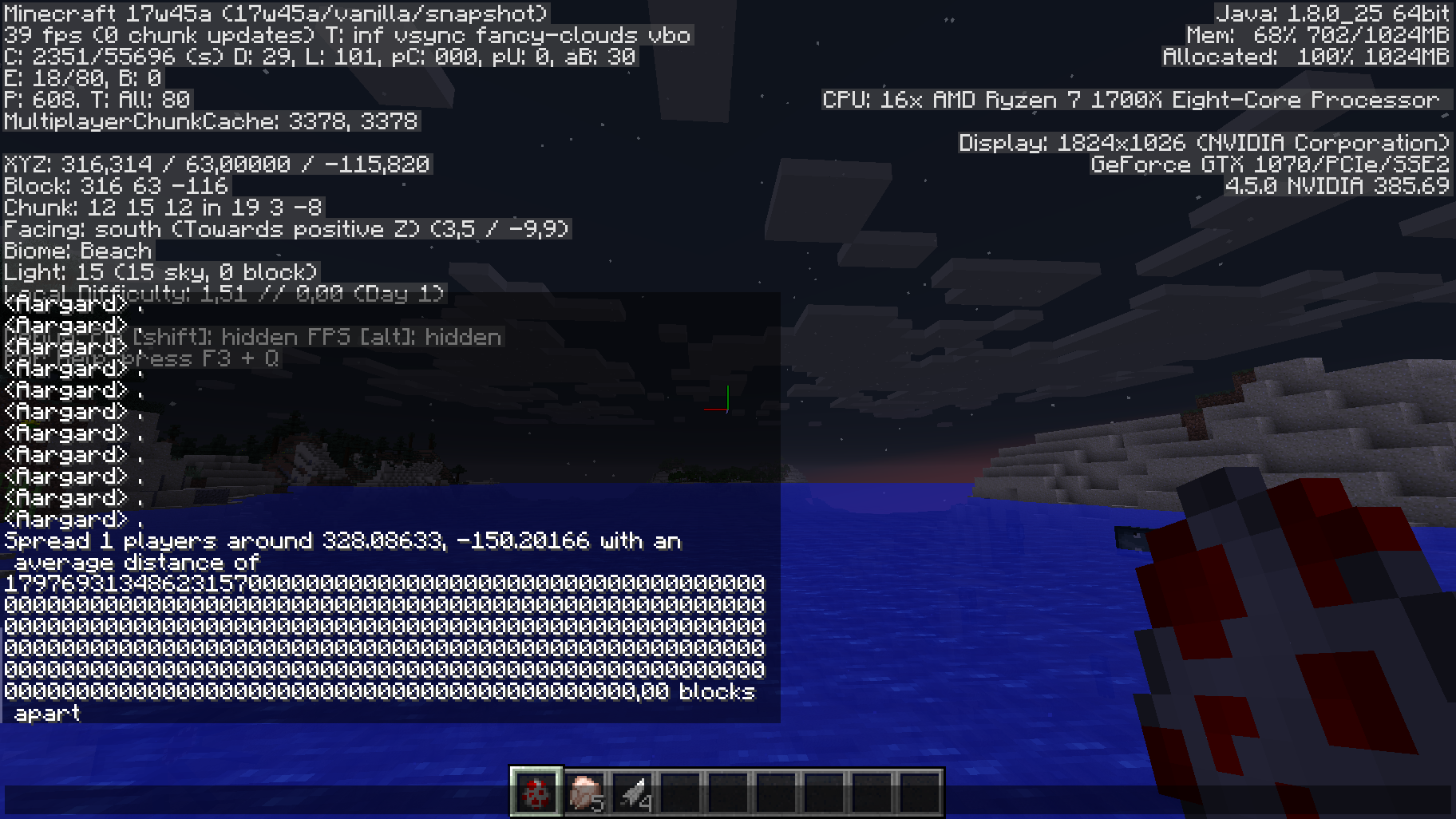 Using the /spreadplayers command with only one entity to move shows an incorrect average distance. See the attached screenshot