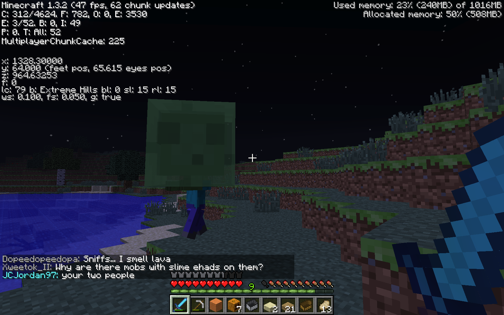 I was playing 1.3.2 on a server and 1.4.2 in single player when I saw zombies, skeletons, spiders and endermen with slimes on thei heads from big to small, at first I thought it was a client side visual bug but then my friend saw it(1.3.2 server) and I was able to kill it and it gave me a slime ball so it wasn't a visual or client side bug the same thing happened in a survival 1.4.2 world(And the biomes were both extreme hills).