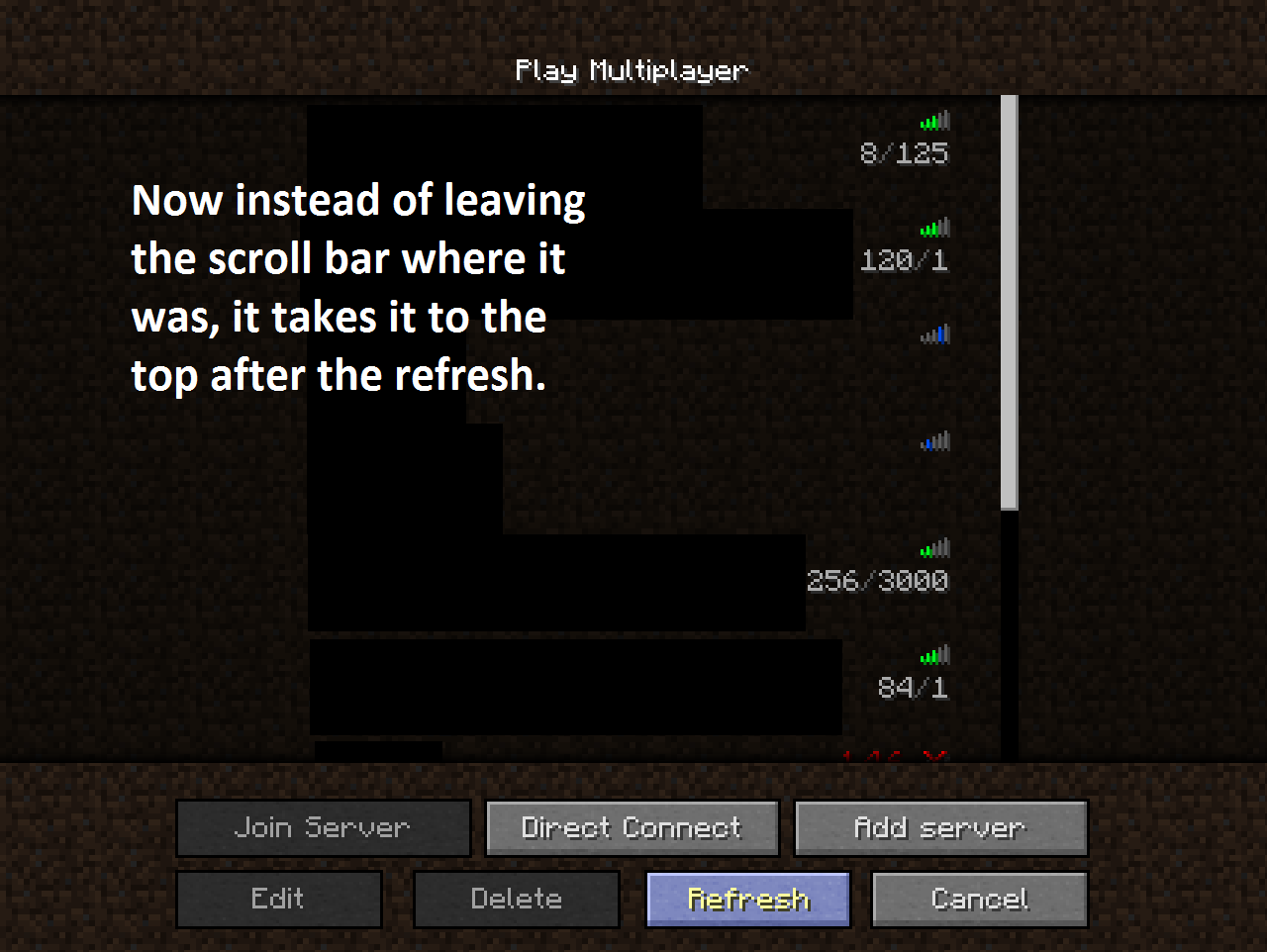 The reason for this issue is quite simple, as the server list refresh button opens a new multiplayer screen and that causes the servers to refresh. A fix for this issue would be to track the position of the bar and set the bar to that when refreshing. Very basic example: