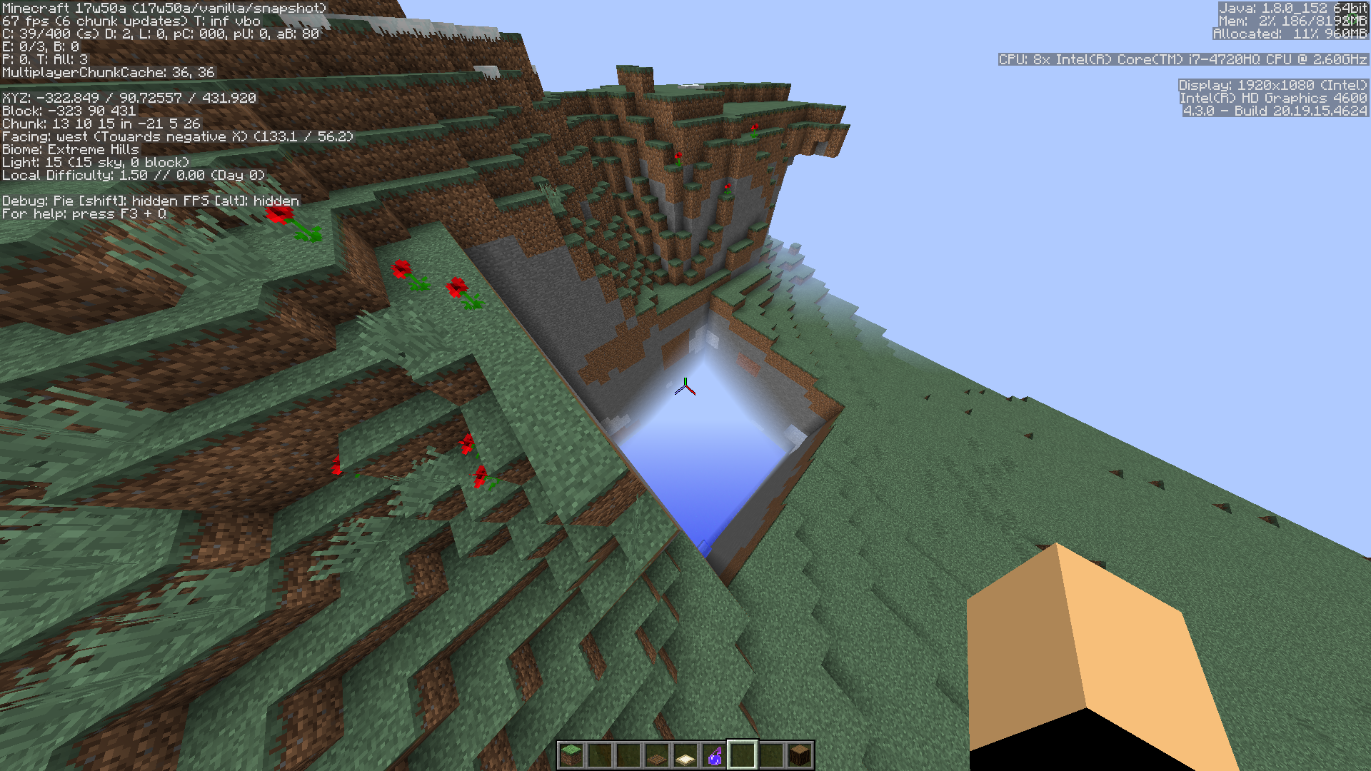 When I was exploring with the latest snapshot (Dec 11 2k17), I found that 1 chunk in an Extreme Hills biome loaded as an Ocean Biome. Using F3, You can that 1 chunk is marked Extreme Hills, anyway this really kinda messes up loading, and it could mean other biomes being spawned in 1-chunk biomes around this other biomes
