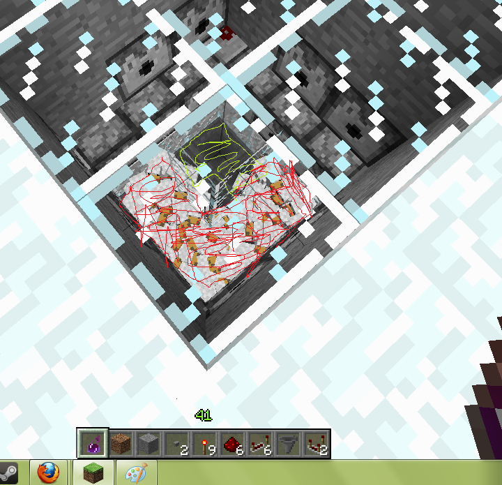 In the first picture I show the empty space highlighted in green, and the dense inhabited space highlighted with red. In the second, I show several chickens who were pushed through the walls of the cage, yet still showed continued northeasterly movement patterns.