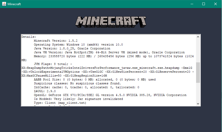 JVM Flags: 8 total; -XX:HeapDumpPath=MojangTricksIntelDriversForPerformance_javaw.exe_minecraft.exe.heapdump -Xmx1G -XX:+UnlockExperimentalVMOptions -XX:+UseG1GC -XX:G1NewSizePercent=20 -XX:G1ReservePercent=20 -XX:MaxGCPauseMillis=50 -XX:G1HeapRegionSize=16M