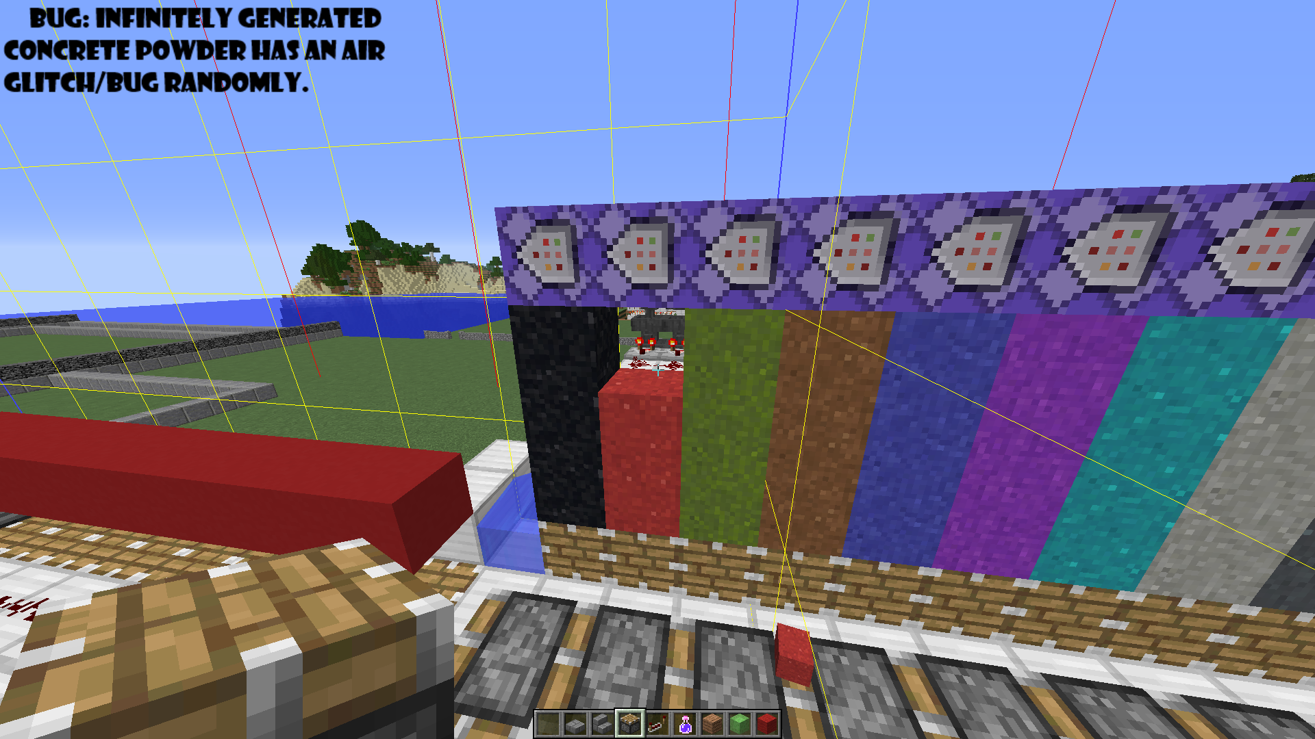 Description: I went on minecraft Realms and one of my friends had built a printer using concrete powder, and I decided to use it to make a red sheet of concrete. I then looked at the "Ink cartridges" I will call them had a weird patch of air despite being an repeat unconditional always active command to set block powder there. However I noticed a fix to it by breaking the block below it.