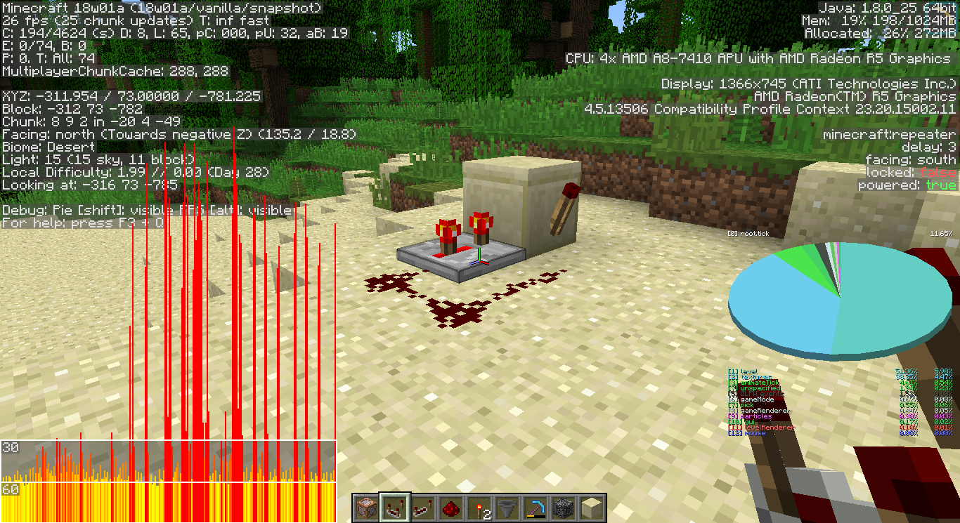 noticed this when updating my command block redstone structures. When player is near a redstone clock, the game seems to generate severe lag spikes. pictures below show debug pie chart and hidden fps graph. spikes get less severe when moving away from the circuit and stop altogether when the circuit stops.1st 2nd and 3rd pictures are of surface level circuit with no attachments. 4th picture is of bedrock level command block circuit.
