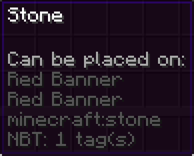 /give @s stone[can_place_on={predicates:[{blocks:"red_wall_banner"},{blocks:"red_banner"}]}]Result:
