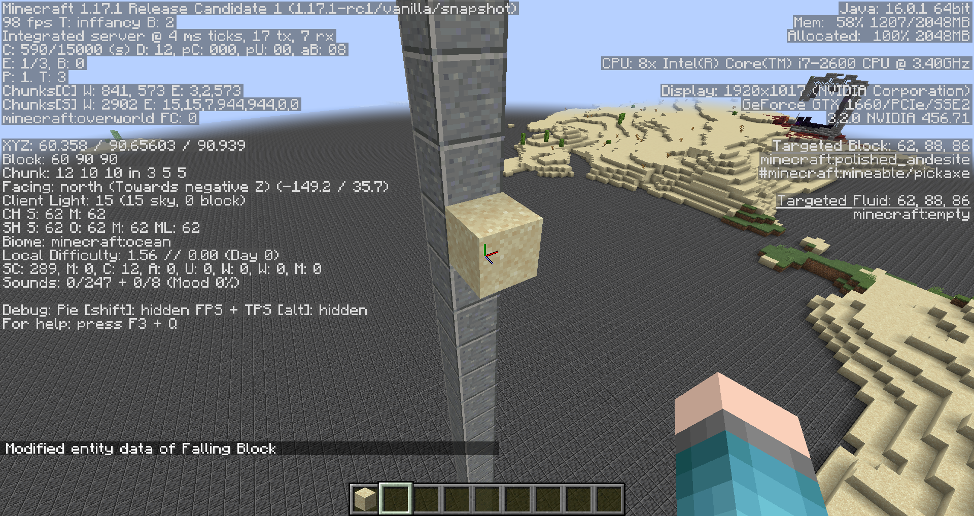 Create a falling_block by placing a sand block, immediately after that use the command (said above)