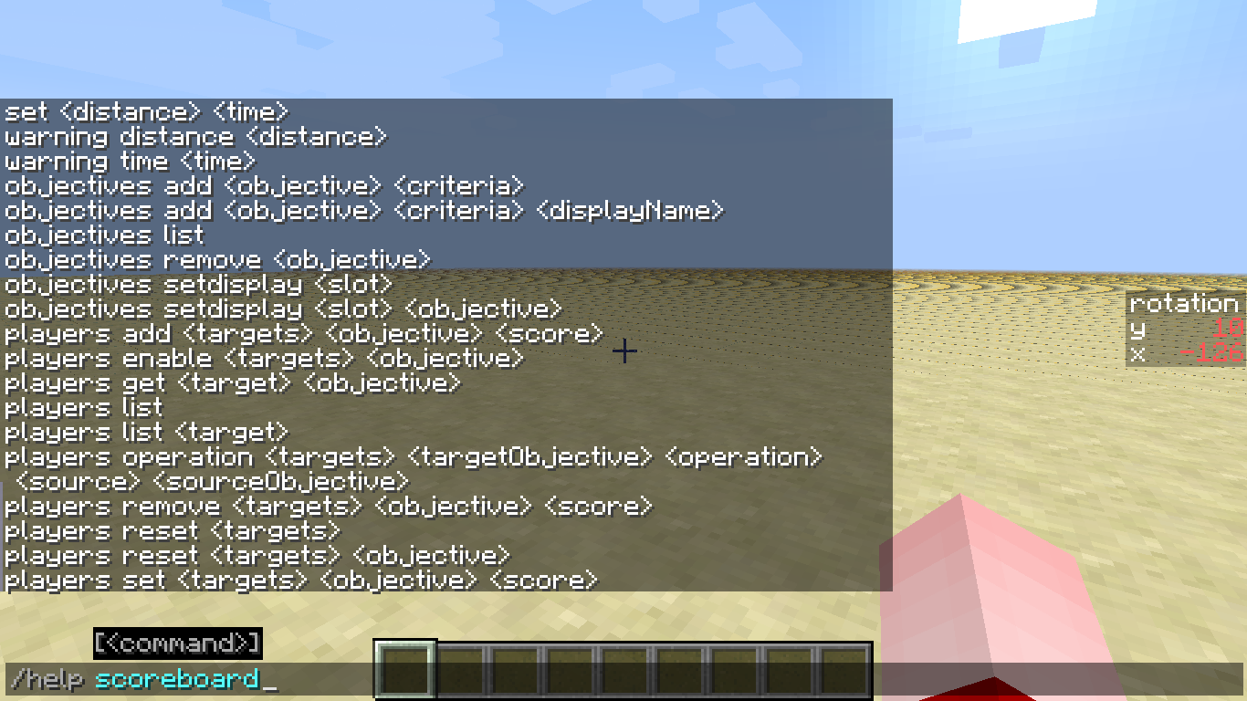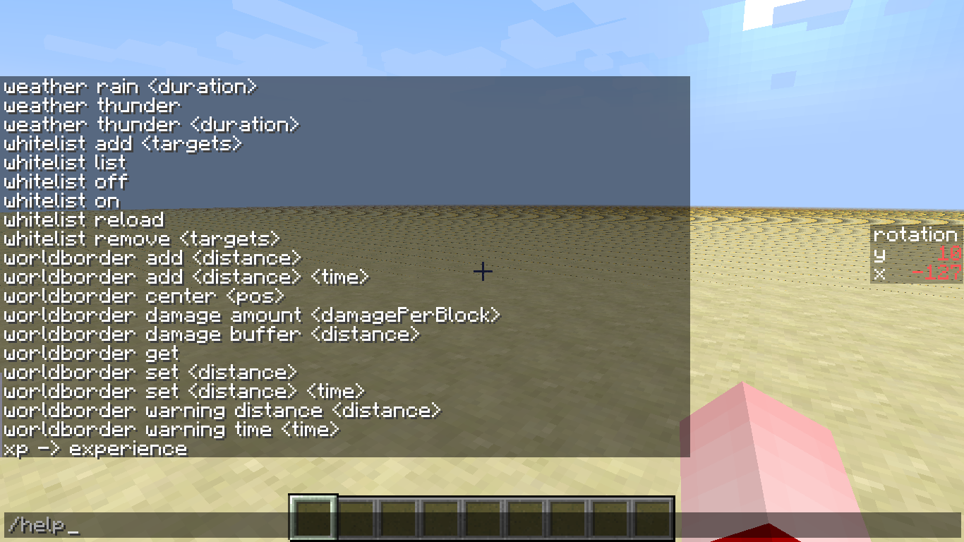 Typing /help alone returns every possible argument combination for every existing command, which not only throws way too much information at the player at once, but doesn't even fit in the chat history in its whole (the farthest you can scroll back up is until around /stopsound).