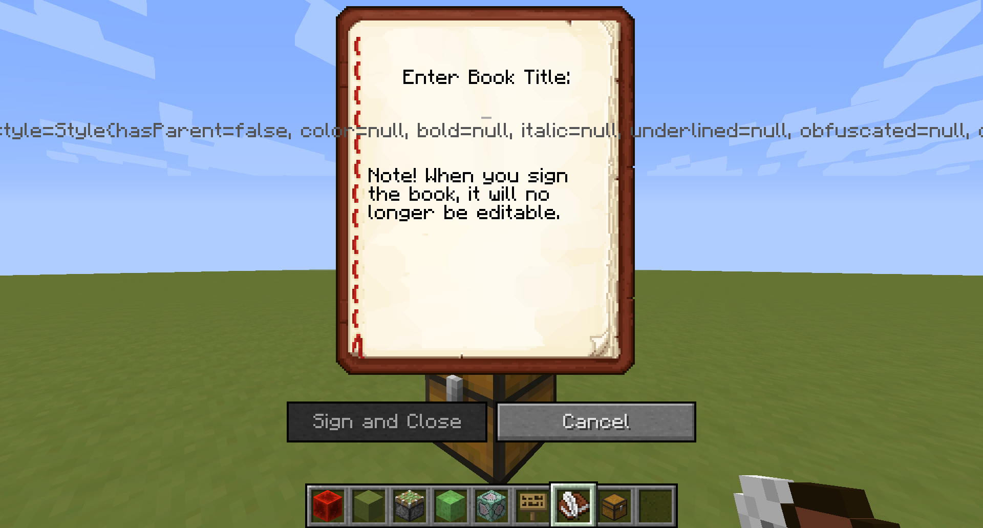 When signing a Book and Quill where it should display by <username> but instead it shows by TextComponent{text:'<username>',...}.