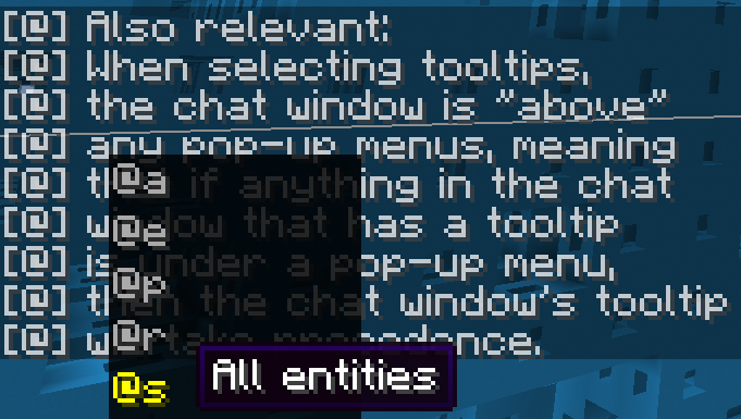 When entering a selector in a command, the auto-completion pop-up menu has incorrect tooltips: @a is tooltipped as “Random player”, @r as “All players”, @e as “Current entity”, @s as “All entities”.