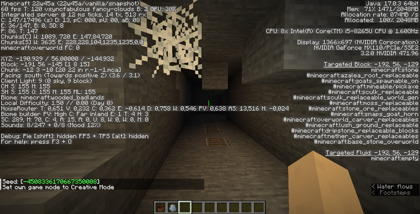 Coordinates: /execute in minecraft:overworld run tp @s -273.89 -47.00 47.65 -6.11 -0.12Version: 22w24a
