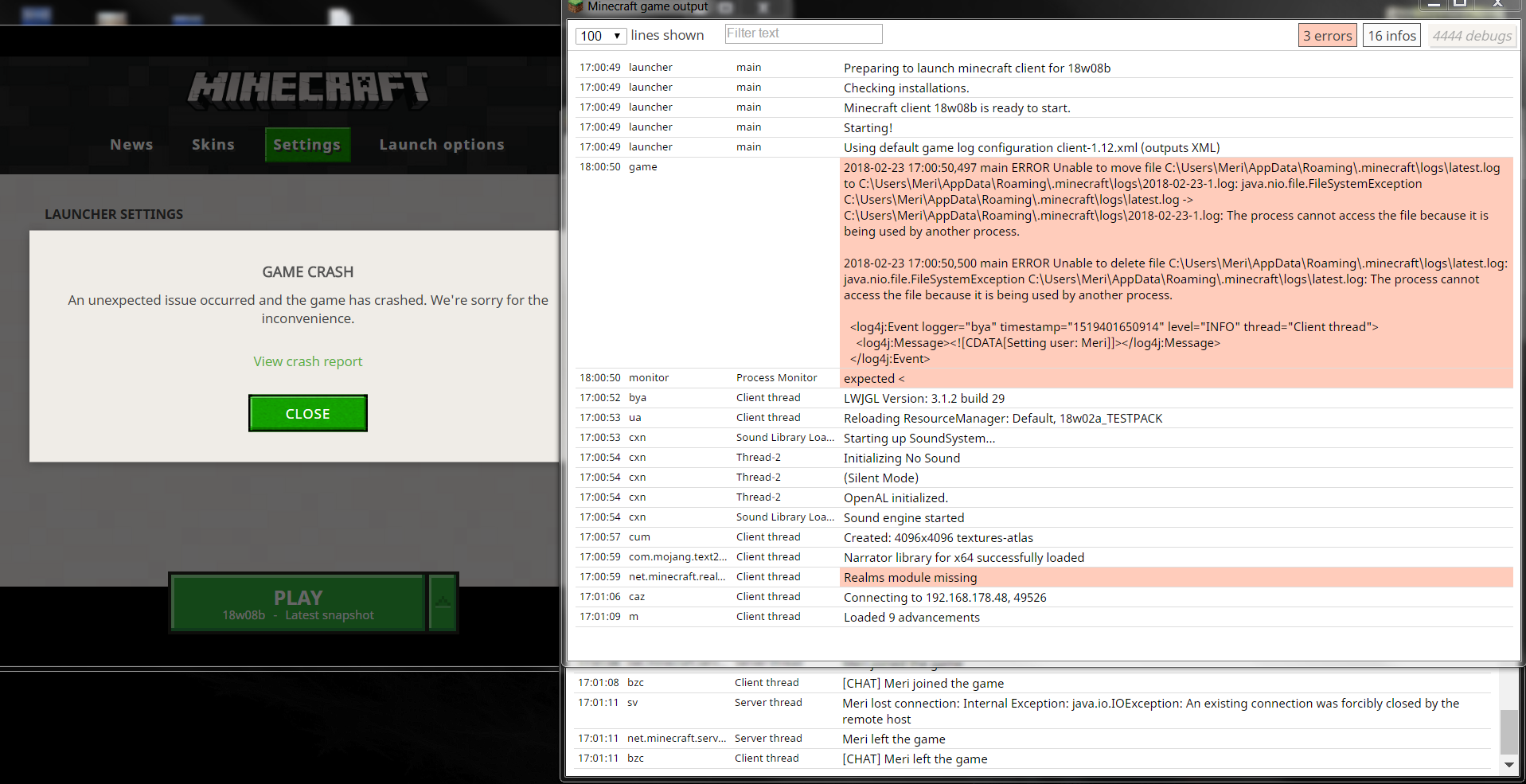 I couldn't click on "View crash report" when the crash happened in 18w08a already, but in 18w08b none of both client logs (when I try to login with a 2nd account into an Open to LAN world opened by account 1) throw an error this time; but on one log (main/1st hosting account) it says: "[PLAYERNAME] lost connection: Internal Exception: java.io.IOException: An existing connection was forcibly closed by the remote host".