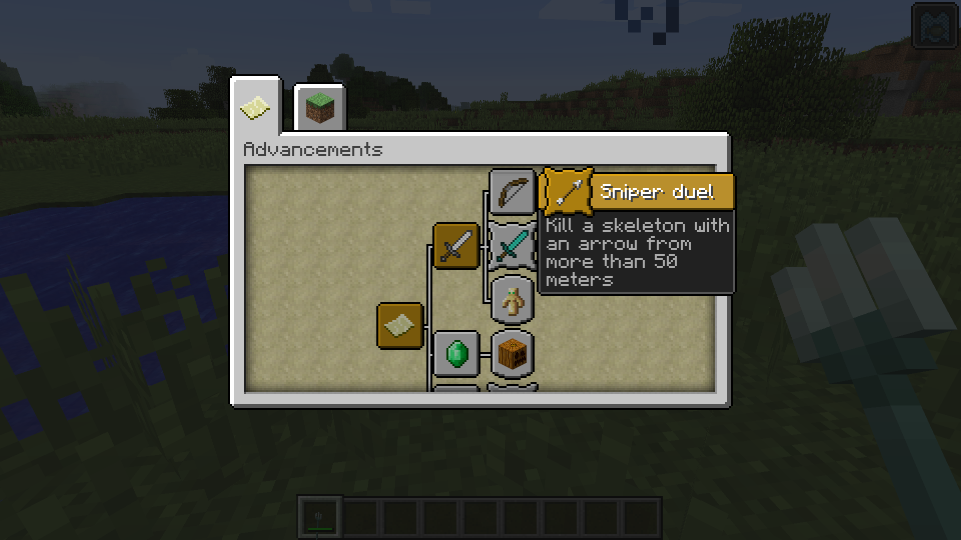 If a skeleton is killed with a trident from more than 50 blocks away, it will grant the sniper duel advancement. The description of Sniper Duel is "Kill a skeleton with an arrow from more than 50 meters".