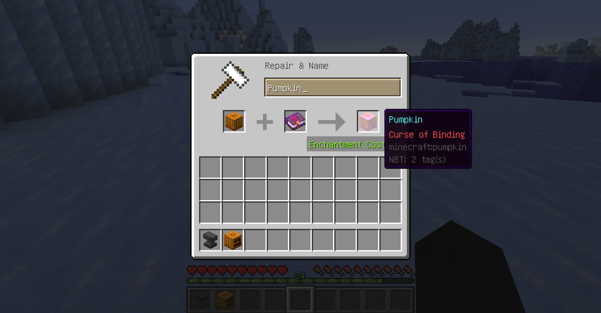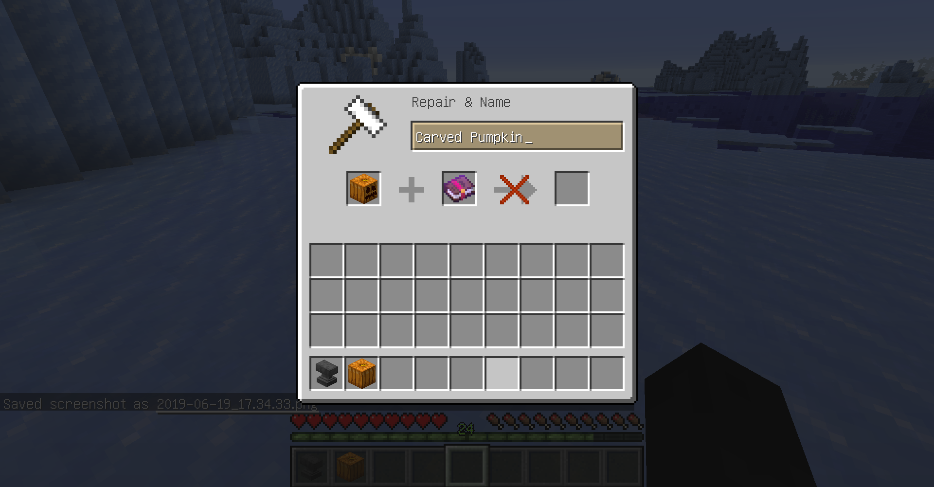 1.14 - still cant add enchantements on carved pumpkins, but only on pumpkins who is notwearable.... FIX it finnaly, how hard it could be to change pumpkin id to carved pumpkin????