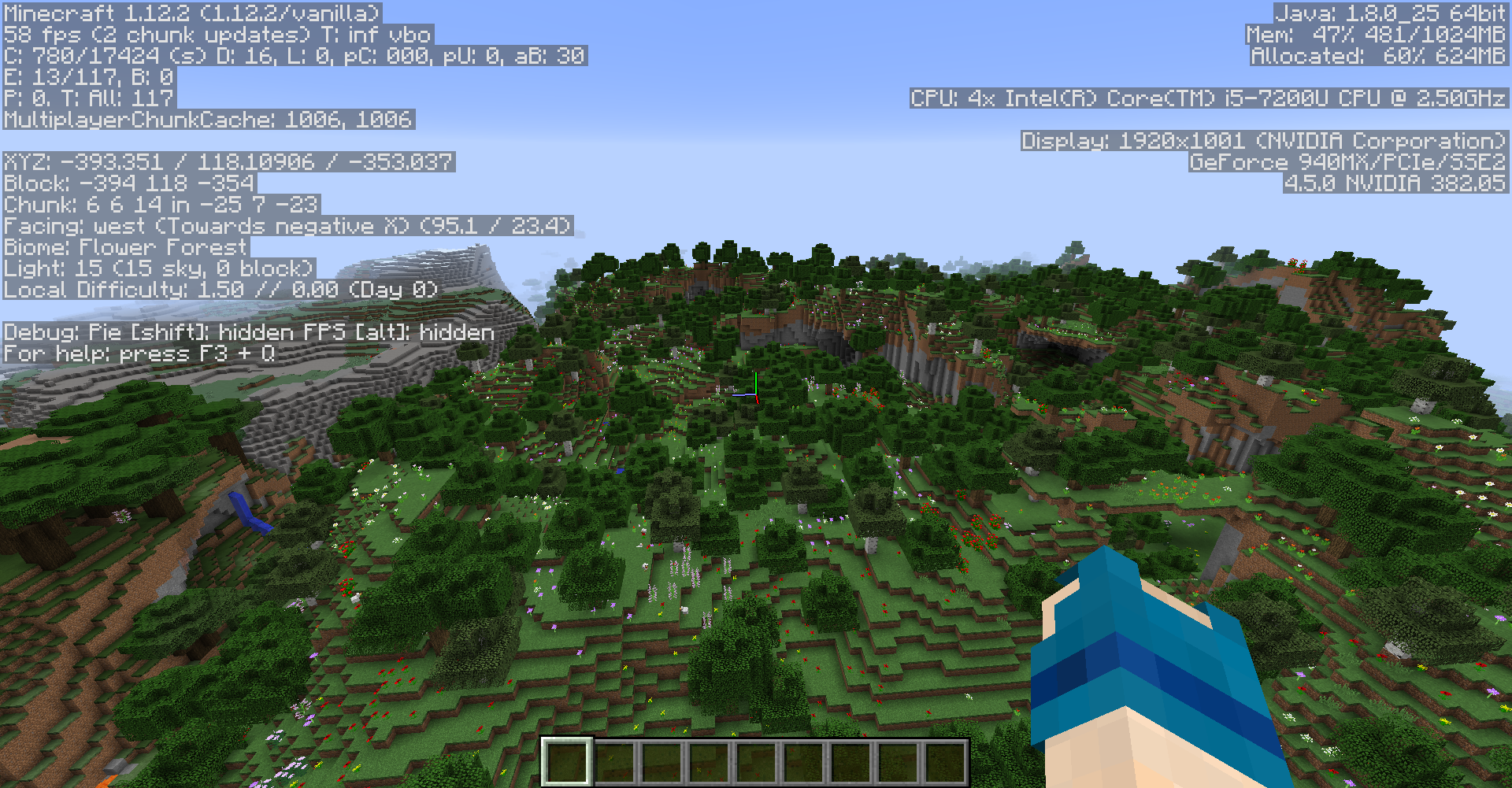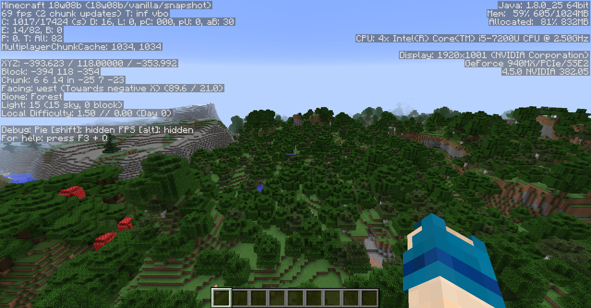 The other picture shows the exact same seed updated to 1.13 Snapshot - Notice NO Flowers and the Biome changed, even though the coords are the exact same.
