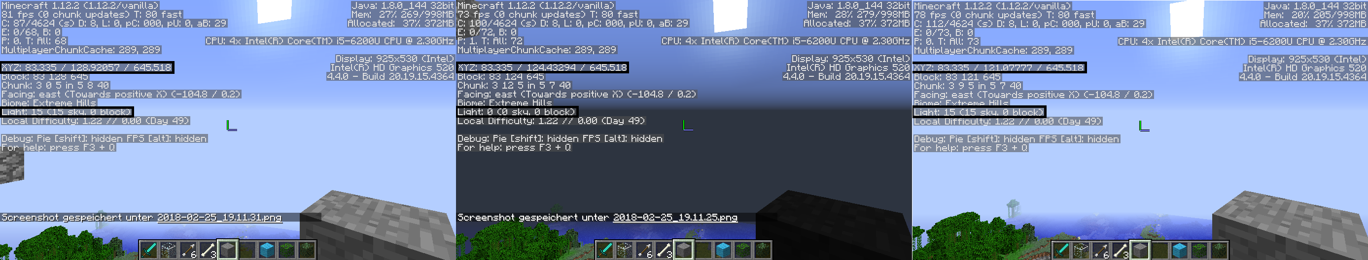 In some places on the map you can find black stains. Mostly in the forests, but also in the free areas or in the sky and olso on walls. At these points the sky light is = 0. The bug appears on startup again and again. (An einigen Stellen kommen auf der Map schwarze Flecken vor, meist in Wäldern ,an Wänden aber auch auf freiem Gelände oder im Himmel. An diesen Stellen ist das sky licht auf null. Der Fehler taucht beim Start immer wieder auf.)