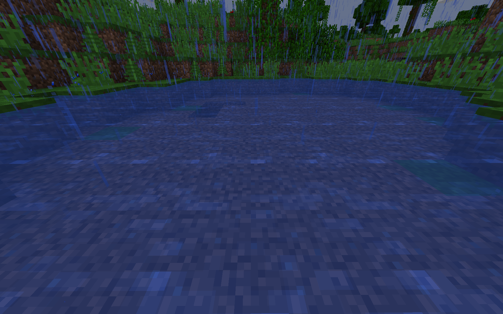 This came about from a discussion in the suggestions subreddit in which the splash particles do not appear on the surface of water when it is raining, and when particles are set to "all". The issue also relates to or possibly causes MC-126138, since without the particles, no sound can play.