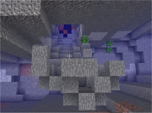 I found underwater ravines with caves partially formed inside them, just hanging in the water. Some seem to be more of a random grouping of blocks, but others are actually cave shaped. (See pics.)