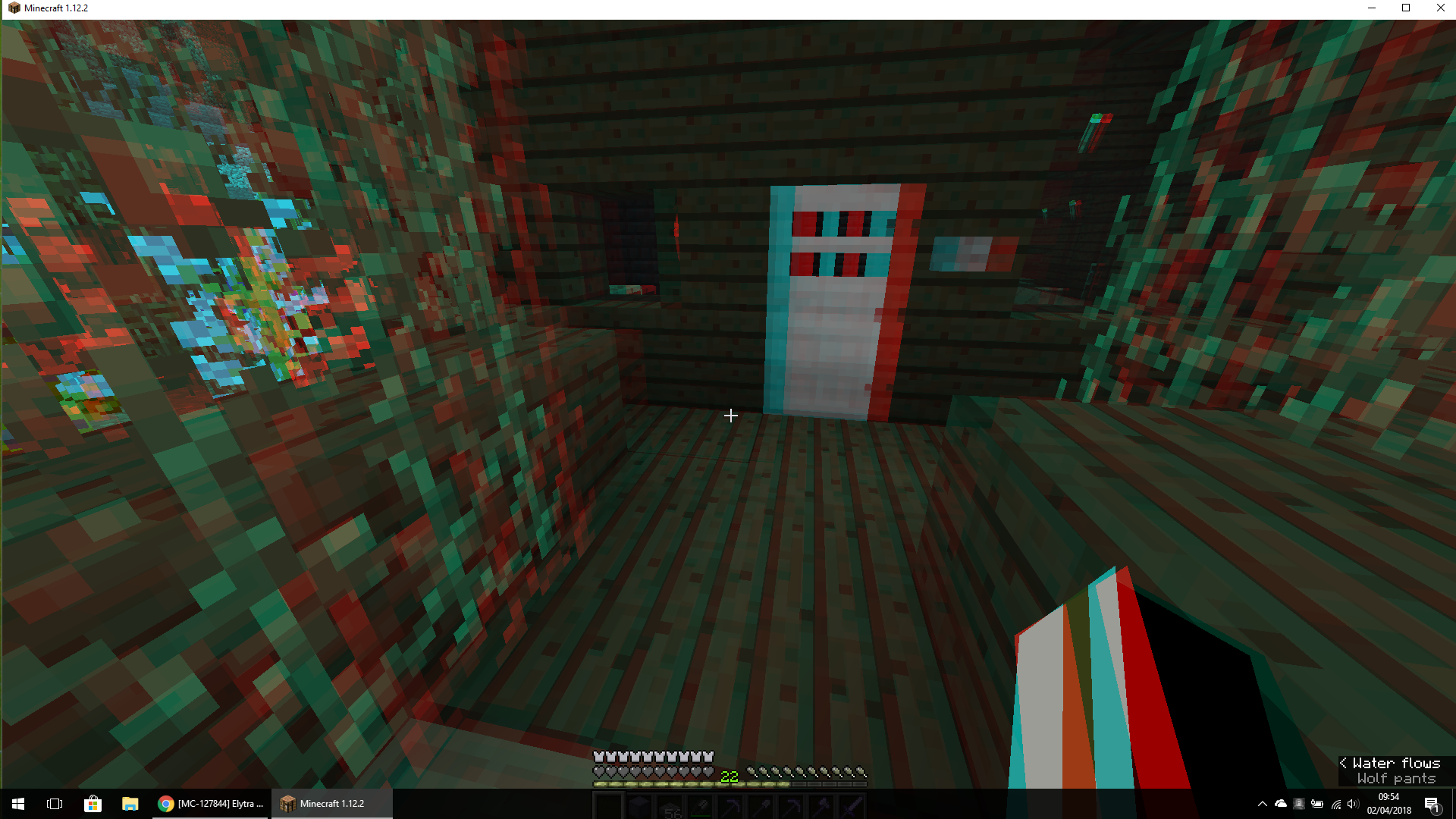 It started at first, with stone being washed out, like grey concrete. I logged out and logged back in and ended up with these below. Appears to duplicate torches for instance one in red and one in blue. Everything has a red and blue stripe and colours are like playing on graphics in the very early games for pc's in the 90's.