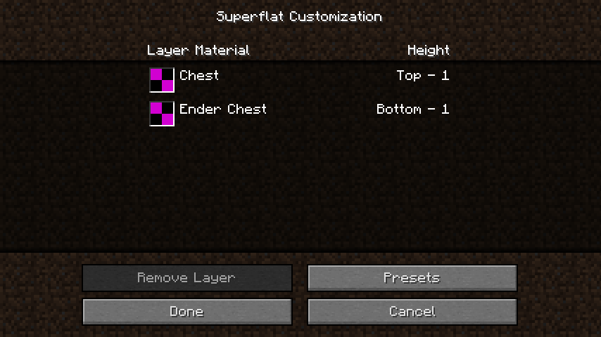I was playing around with the custom superflat world thing. I was going up by 10s to just see what blocks would come up. I hit 130, the ID for Ender Chest.