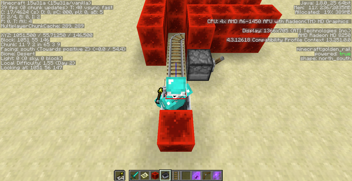 Ride a minecart around a corner in a 1-block wide trench/tunnel