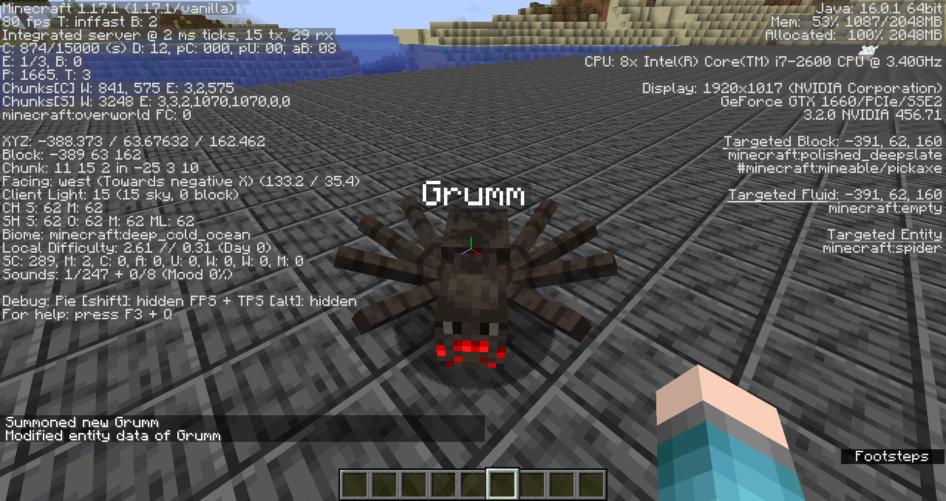 /summon spider ~ ~ ~ {CustomName:"{\"text\":\"Grumm\"}"}→ ✔ You can see its name by looking at it