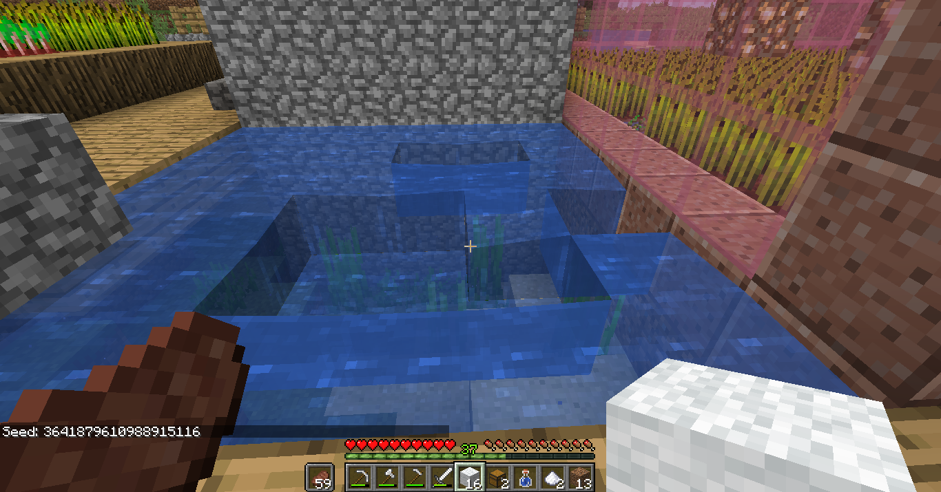 Oh, and this pool is as generated by the world. This part of this village has not yet been touched, except by me falling into this water. World seed is shown in the screen shot. Let me know if you want any additional information.
