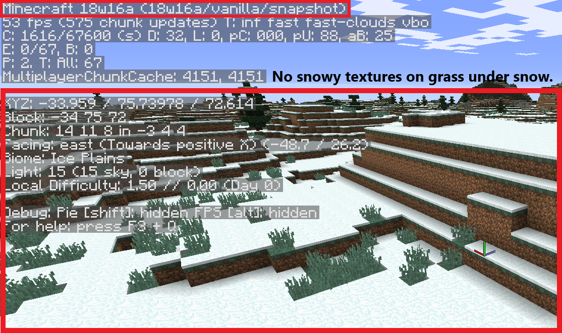 In the newest snapshots, the grass blocks do not change to snow textures with snow layers naturally (preloaded) on them. They only appear when the player places snow layers down or it snows with the weather. Not affecting gameplay, but is slightly annoying to look at. I used both vanilla and optifine for testing, and both on 1.13 snapshots failed to load snowy grass.