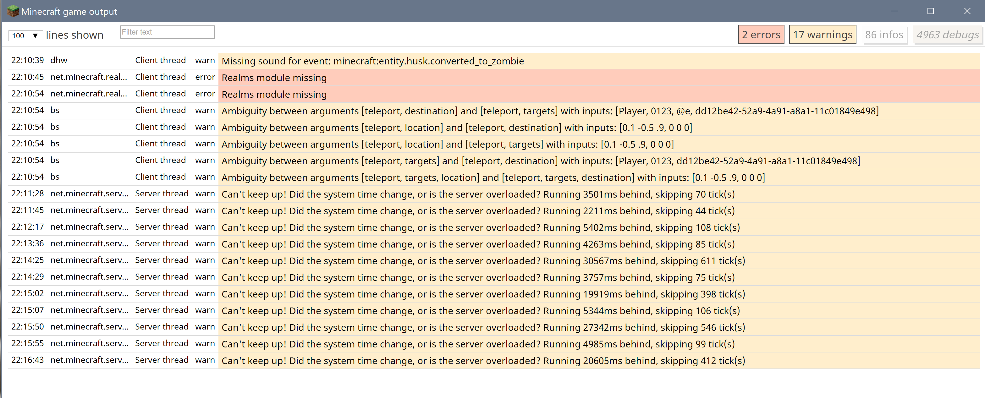 I've attached a snapshot of the warnings and errors from the output of my Windows 10 test. Note that other than the "can't keep up" server thread errors, there is nothing else unusual. When the game does crash, no additional messages appear in the output. The game simply quits and/or JAVA reports that it has stopped working.