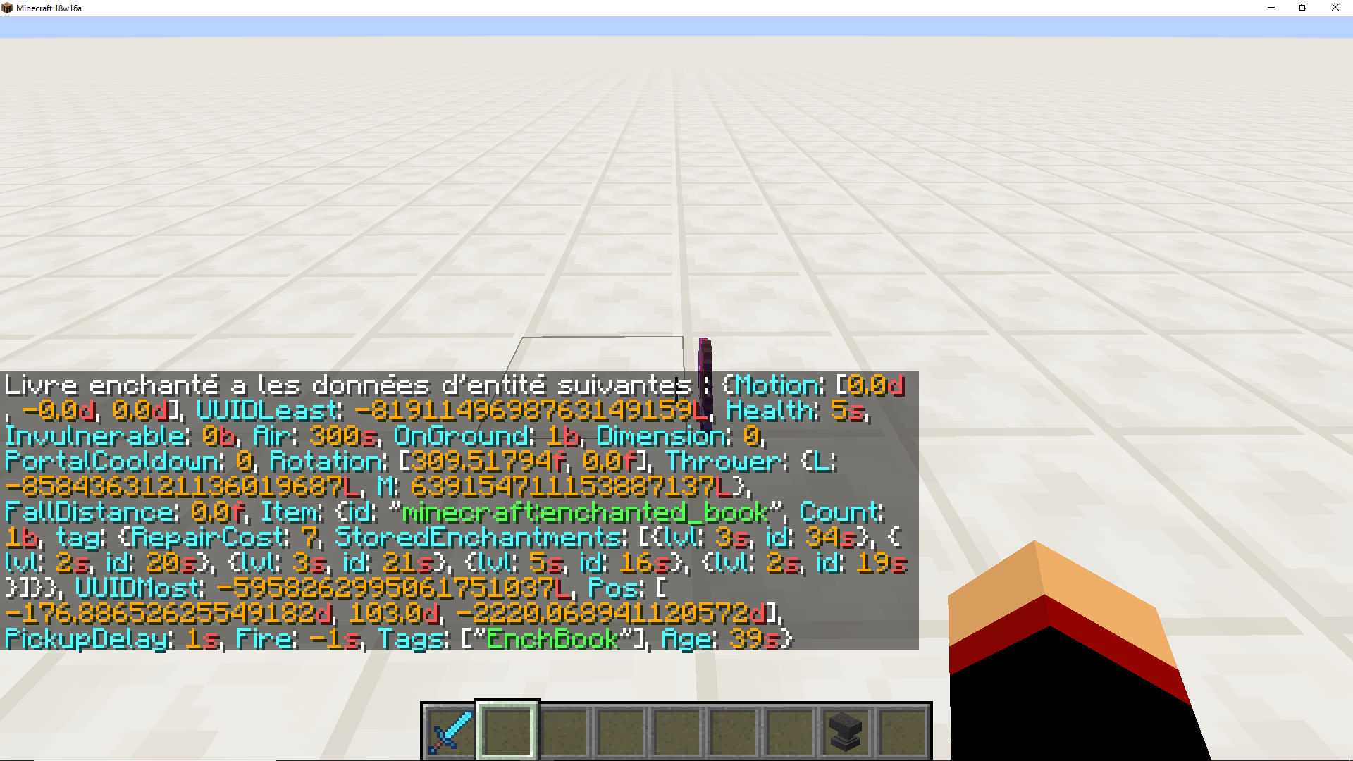 /give @p minecraft:diamond_sword{ench:[{id:-1,lvl:0}]}2- Take a enchanted book "sharpness V" for example