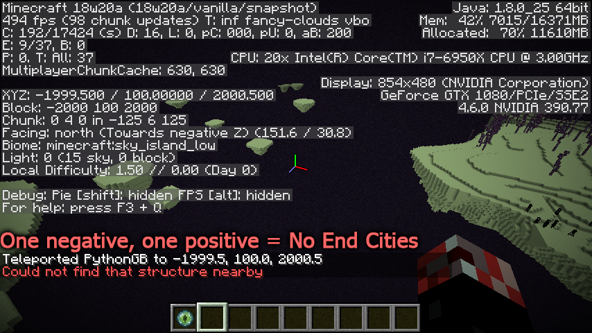 I've noticed throughout the development cycle of 1.13 that End Cities spawn extremely very rarely. This is NOT a duplicate of the bug that was fixed in 18w20a (MC-125615) which fixed it so End Cities are no longer cut off - In a nutshell, when I travel to the End in my snapshot world (currently on 18w20a) and I try to locate End Cities using the "locate" command, they ONLY ever seem to generate in negative co-ordinates (e.g. X -2000, Z -2000) and never in positive co-ordinates (e.g. X 2000, Z 2000)