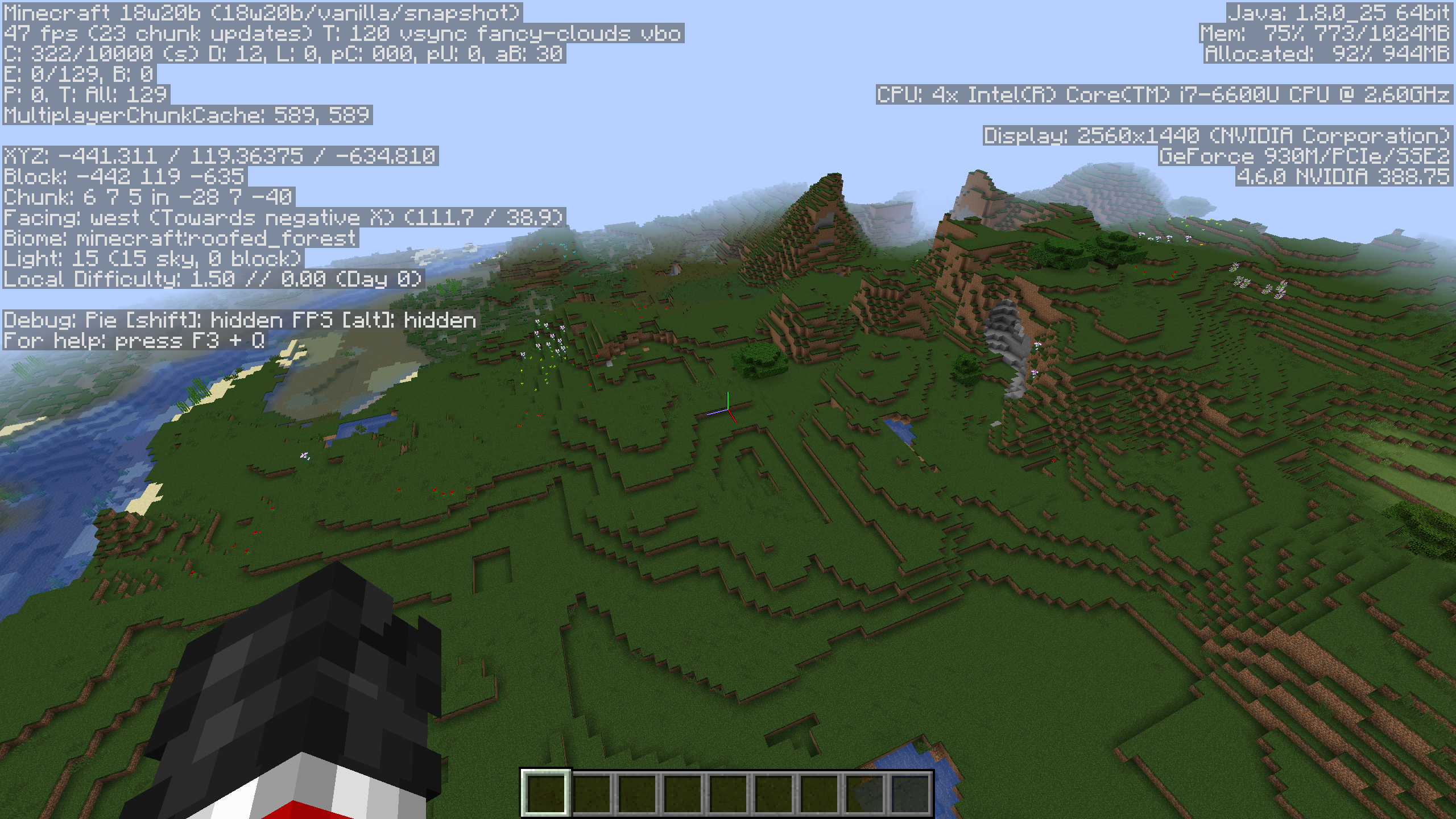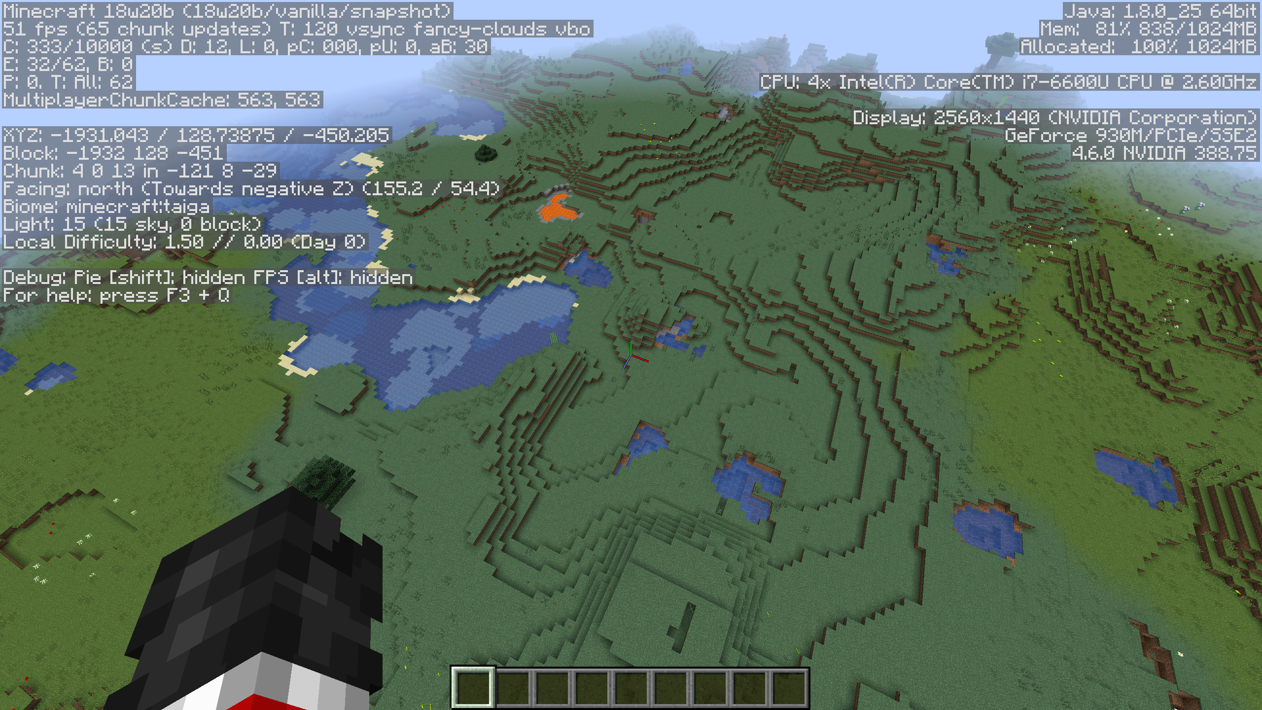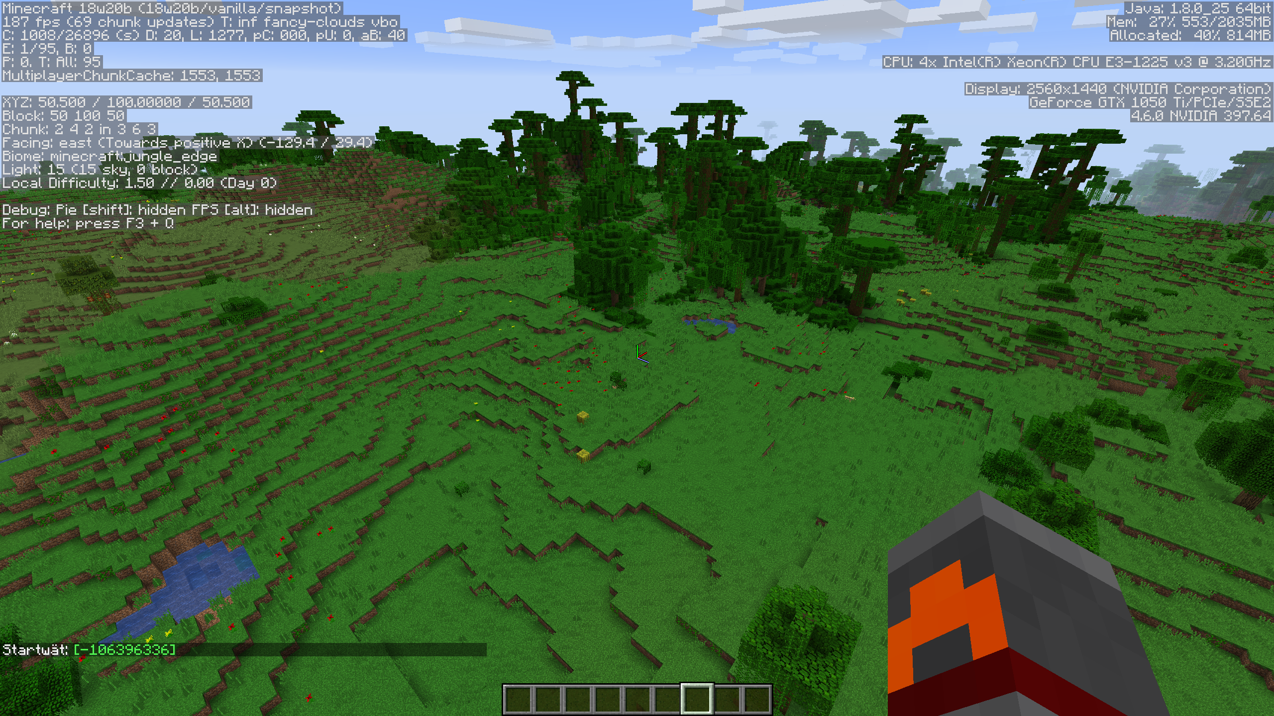 In 18w20b, trees are generating in the ground or not at all. The biome is shown in the screenshot. Affects forest, swamp, roofed forest, taiga, jungle, etc. Either it does not affect extreme hills with trees, or trees randomly decide to generate. But when I am flying by trees that generate there is extreme generation lag. This also appears to affect underwater plants like kelp and sea grass.