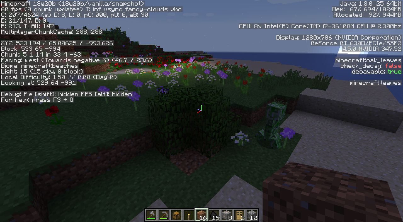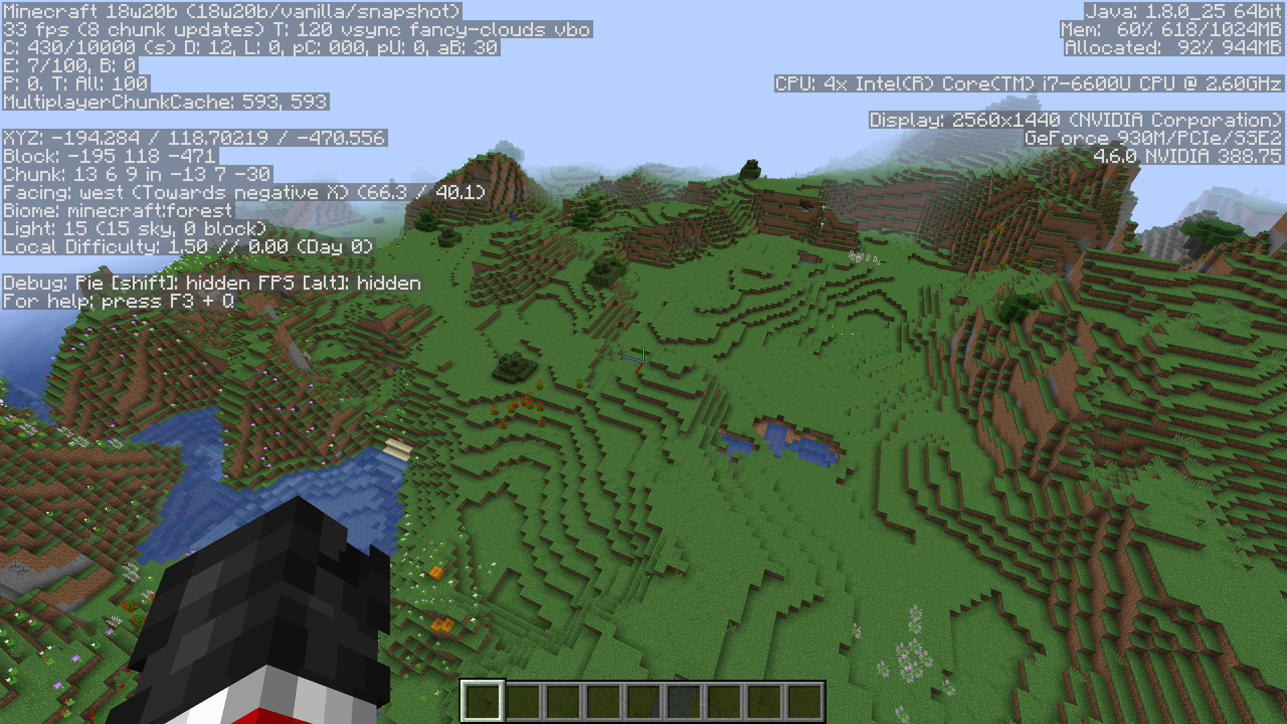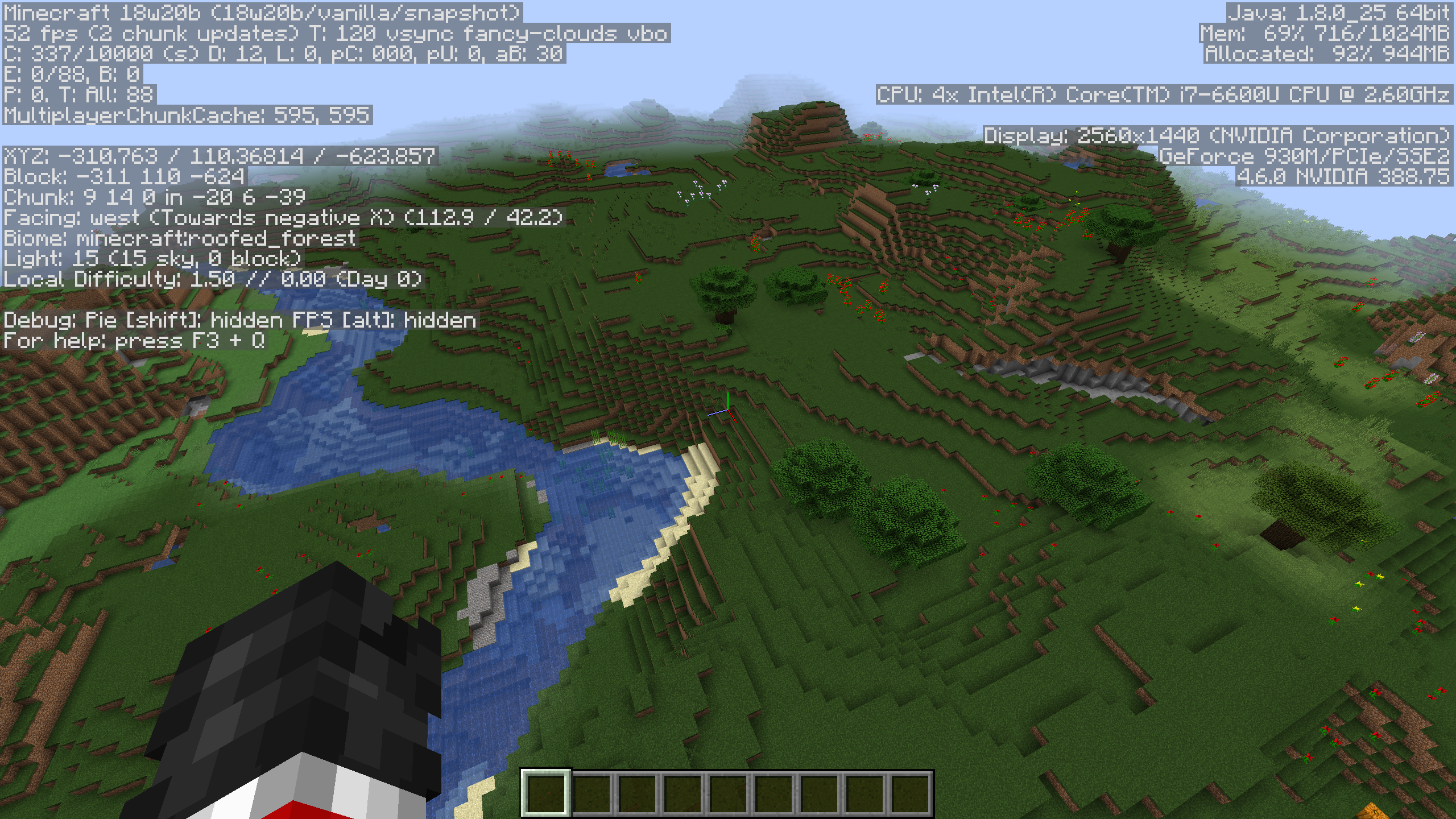 In 18w20b, trees are generating in the ground or not at all. The biome is shown in the screenshot. Affects forest, swamp, roofed forest, taiga, jungle, etc. Either it does not affect extreme hills with trees, or trees randomly decide to generate. But when I am flying by trees that generate there is extreme generation lag. This also appears to affect underwater plants like kelp and sea grass.