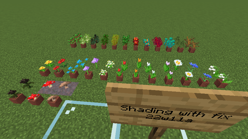 In 14w25a, models involving flat 2D planes had those planes be rendered darker depending on their directions. This affected blocks such as grass, flowers and mushrooms, and was ultimately fixed (MC-57159). However, the same version also caused plants in flower pots to appear darker for the same reason, and this was not fixed.