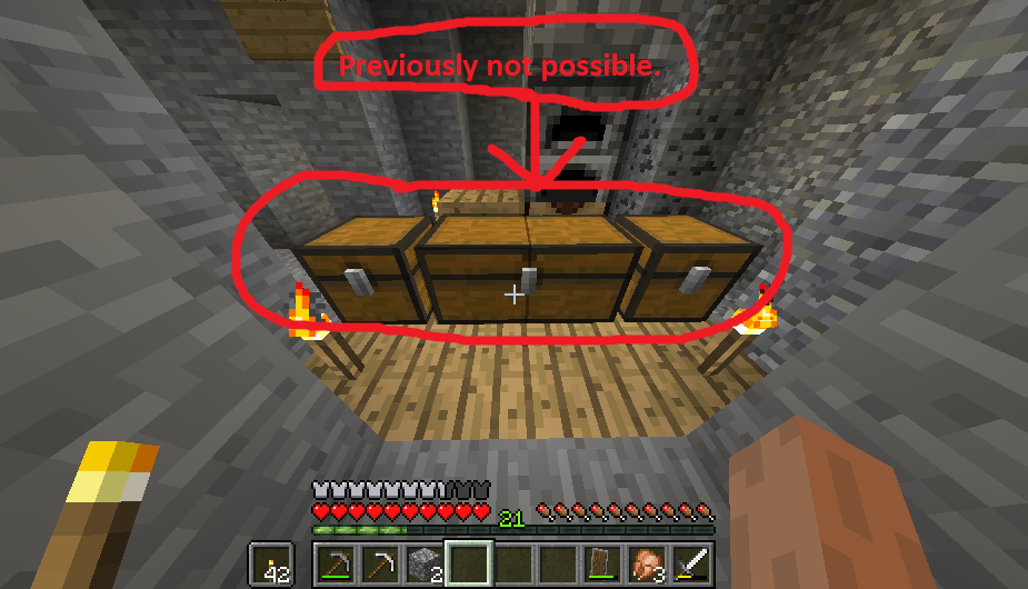 When you place chests down, they wont form double chests. This glitch is quite inconsistent as sometimes it works and doesnt. Im going to explain the steps to reproduce this glitch, but its quite confusing so do look at the pictures attached.