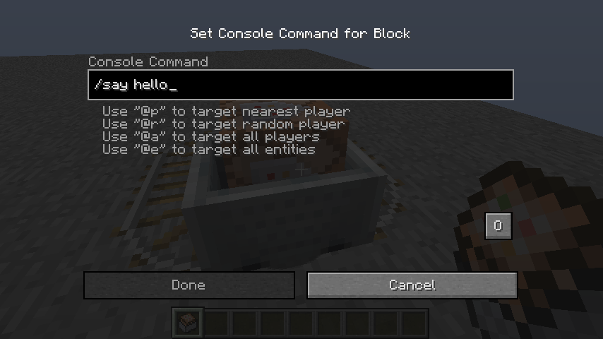 When I type a command in a command block minecart, the 'Done' button is always disabled even when I've typed a command in it. A workaround is to press enter when you've typed the command in then it works but still needs to be fixed.