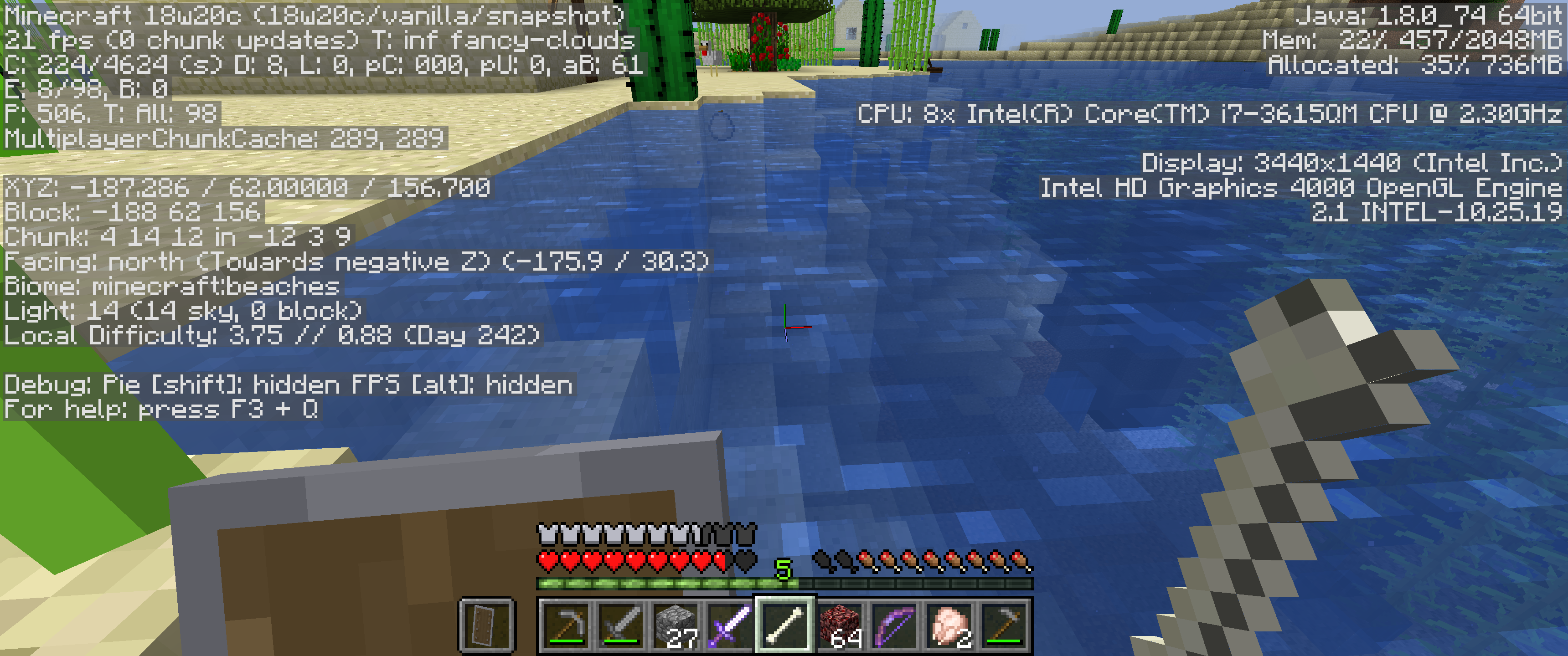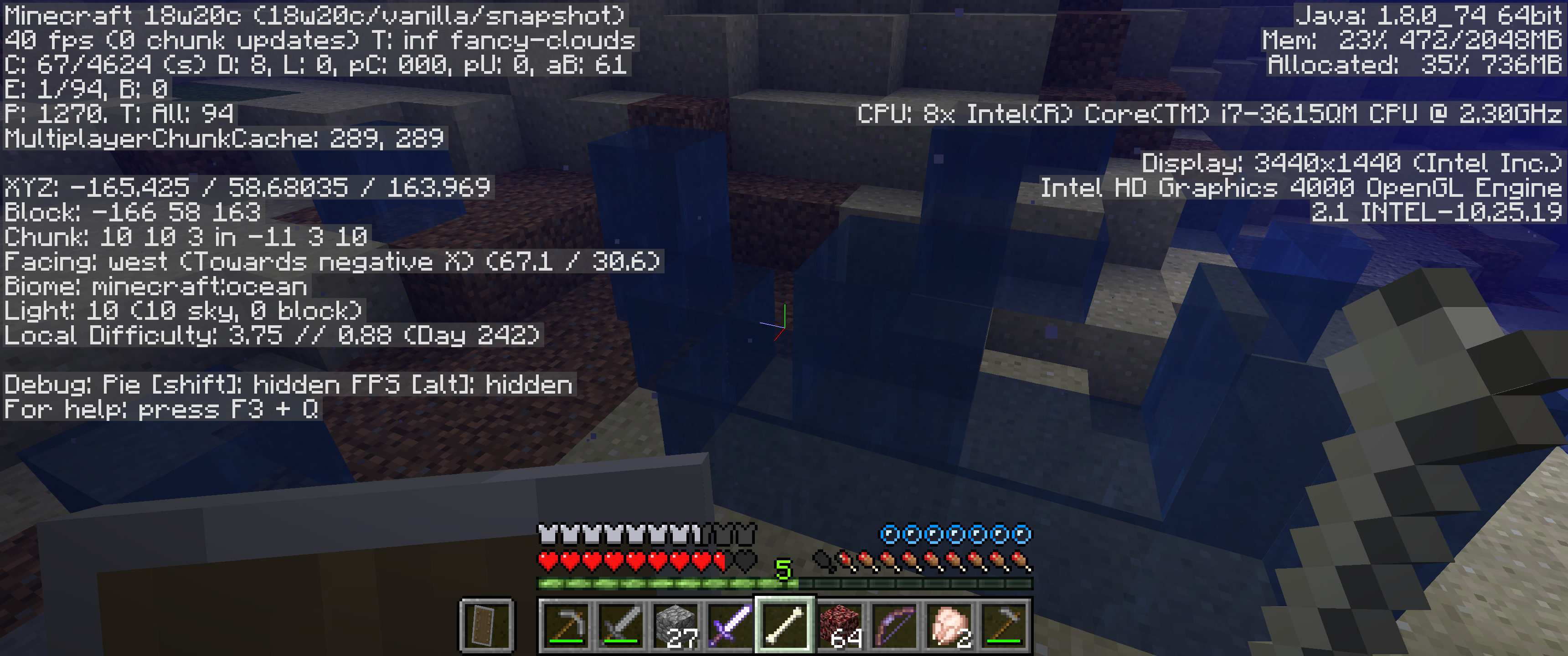 Random underwater blocks seem to be missing or flow in different directions at different depths. I did notice that the performance has finally improved back to approximately 30 fps however there are random artifacts in the water but none observed above ground.