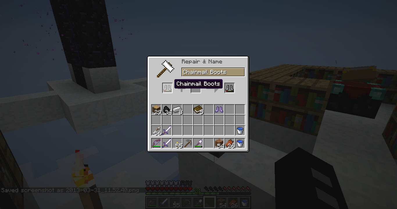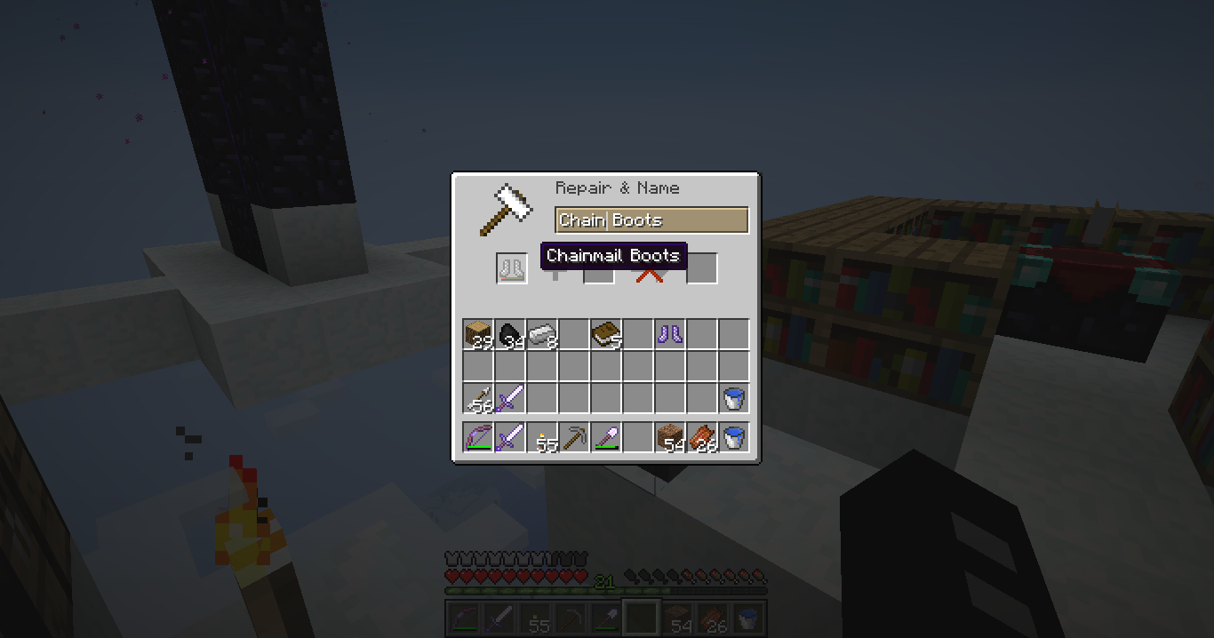 Furthermore, when you repair the boots with iron ingots / combine with another chain boots / add an enchanted book in the anvil, the name "Chainmail Boots" is automatically put into italics in the way that custom names (and only custom names) are. Alternatively put a non-italics "Chainmail Boots" into the anvil and edit its name to "Chain Boots". The anvil does not give the option to take the item from the right-hand slot with the new name, it just has the red cross through the arrow as if you had not altered the name at all.