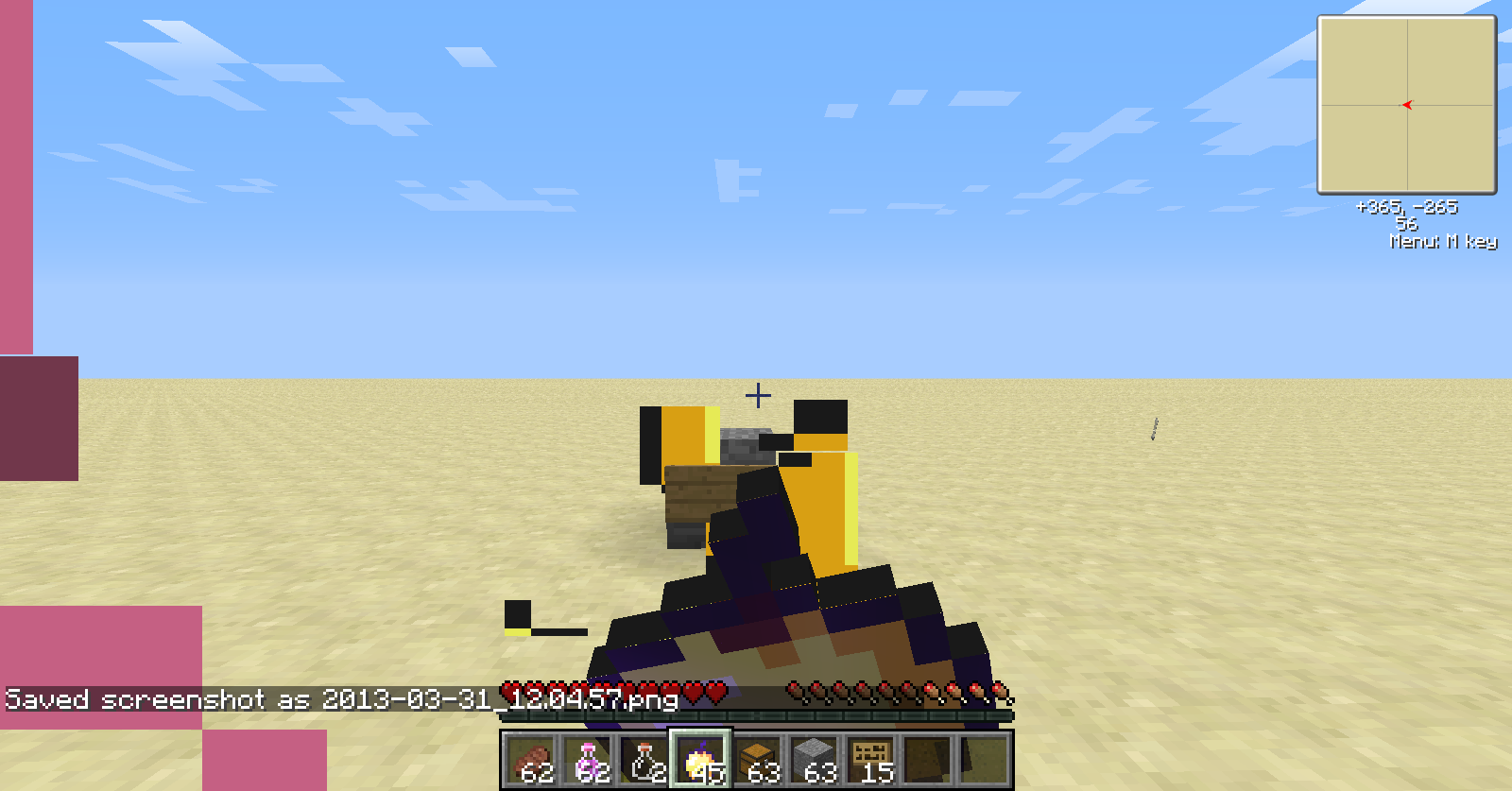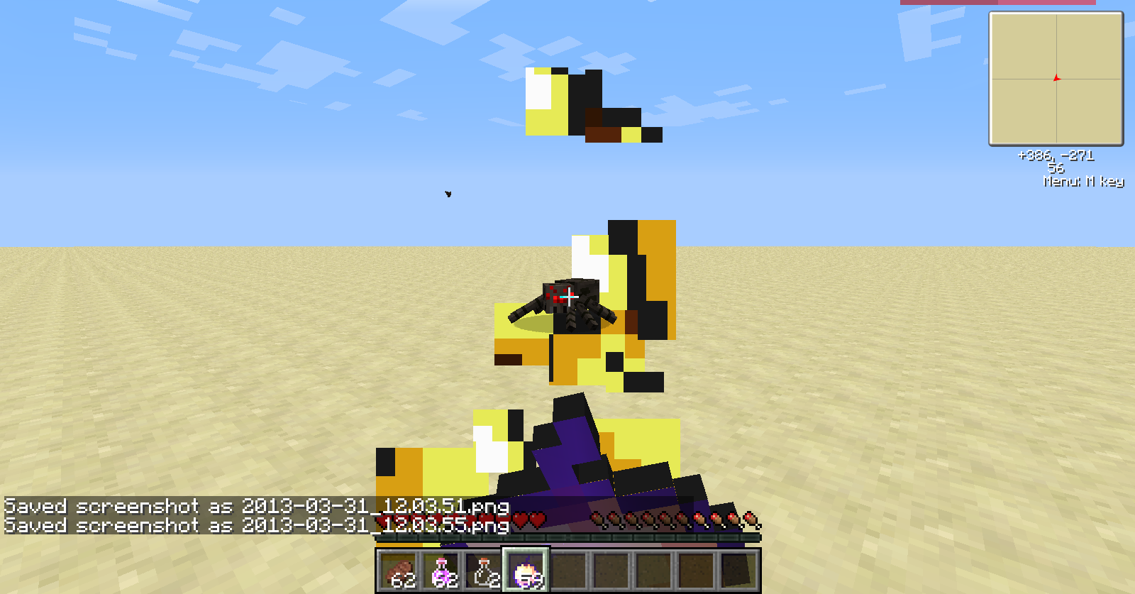 I'm not sure if this is a bug or not, but when eating, some entities and chests/signs are visible through the food particles. Most blocks are hidden by the particles given off, but mobs, chest, and signs are not. The food particles are behind them as though they were in front of the particles. I am using Optifine, but I'm not sure if that makes a difference.