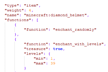 I have a custom loot table and I have put as an entry a diamond helmet with random enchantments from 1-39 levels.. The loot table is working perfectly but the enchantments cannot be applied like this without commands..I also got a sword with Smite 1 and Bane of Arthropod 3 again as a different enchantment,and also Enchanted books don't work