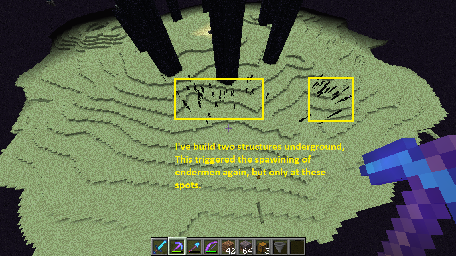 At this point the endermen can spawn at this one by one square. in every y coördinate as long as there is a block for them to spawn on, you can also remove the block you place to trigger the spawing of the endermen at this position. Because the endermen will not stop spawing wen you do remove this block.